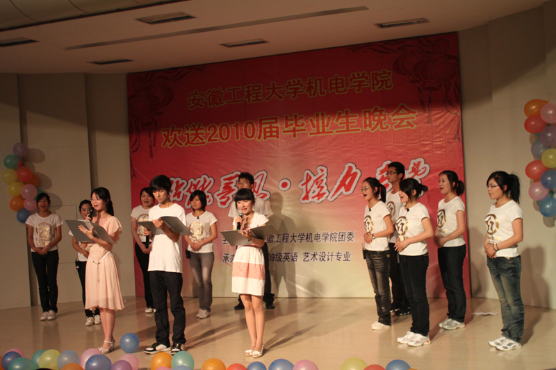 本次晚会由机电学院团委主办,09级英语、艺术设计专业承办。同学们以舞台剧、手语、乐器合奏、舞蹈、朗诵等多种形式为2010届毕业生上演了一个个精彩节目,表达他们对即将离校的师兄师姐恋恋不舍的惜别之情及真诚祝福。