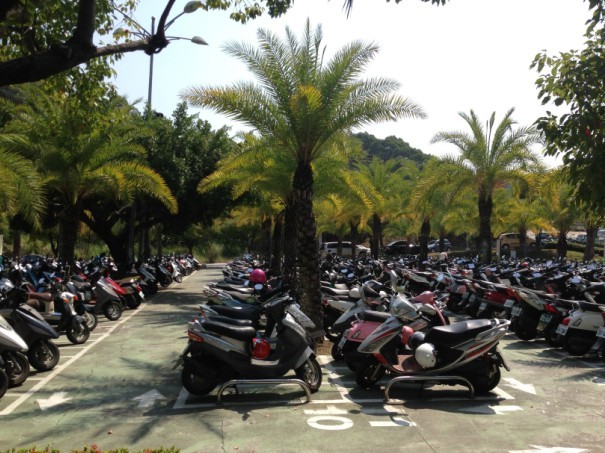 校园里有很多学生是台中本地人,他们就住在家里。还有的是住在校外的第二宿舍。台湾的学生基本都有一辆摩托车,他们那边叫机车。本地的学生有课就骑机车来学校上课,校园里也有个绿树环绕的机车停车场。下课了台湾学生就潇洒地戴上头盔,骑上机车回家。因为学校在山上,放学骑机车沿着下山的路回家,往下冲车速都很快,会有一些穿着工作服的同学在下坡路上维持机车车速。