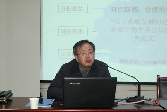 本次讲座邀请了生化学院副院长、微生物发酵安徽省工程技术研究中心主任、发酵工程省级重点学科负责人、农产品加工与贮藏硕士点负责人陶玉贵教授主讲,题为 “从巴氏灭菌发明——浅谈科技创新与治学”。