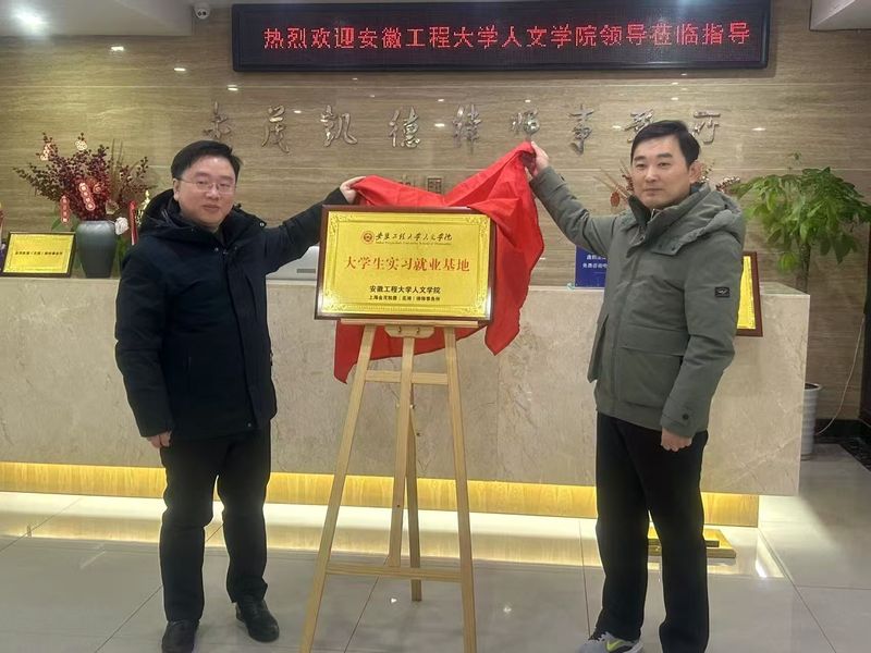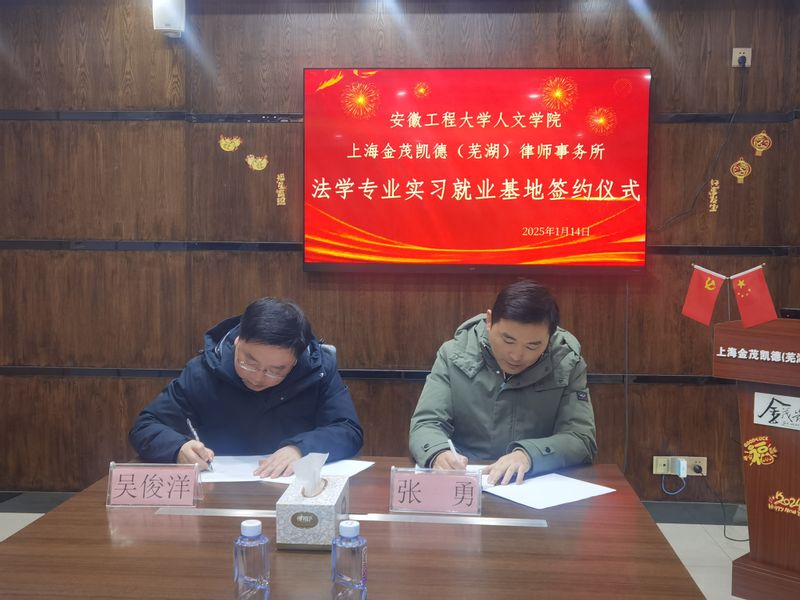 本网讯 为深入推动法学教育与法治实践深度融合发展,不断创新法治人才协同培养机制,提升学生法律实践能力,1月14日,人文学院与上海金茂凯德(芜湖)律师事务所举行合作签约暨实习就业基地揭牌仪式。上海金茂凯德(芜湖)律师事务所主任吴俊洋,律师事务所管委会主任陆在春,律师事务所事业合伙人王晓春、唐磊,学院副院长张勇,法学系教师杜蓓蕾、曹刚果,社会工作系教师梁琛琛参加签约揭牌仪式。签约揭牌仪式由上海金茂凯德(芜湖)律师事务所管委会主任陆在春主持。