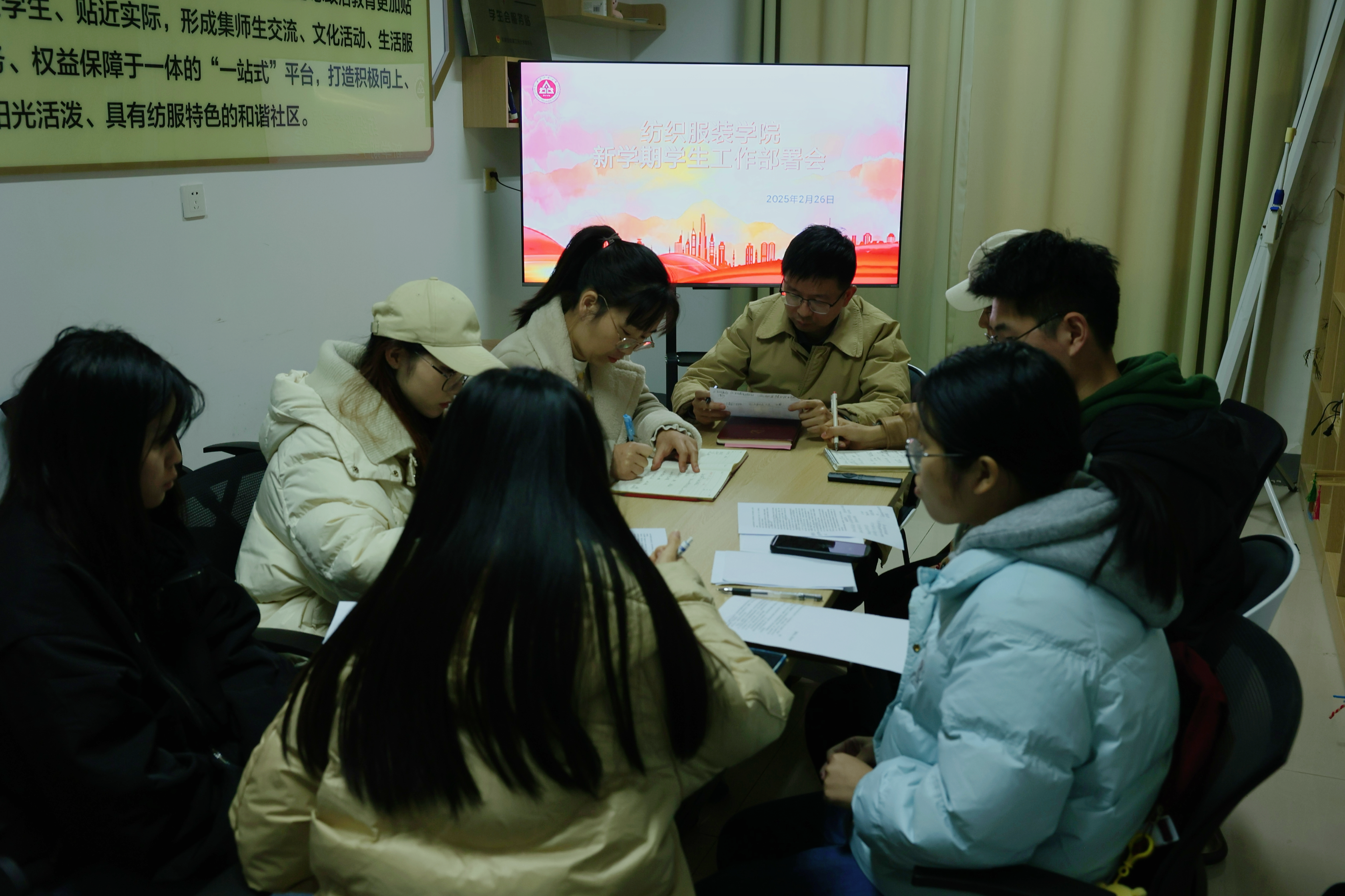 本网讯 2月26日,纺织服装学院在一站式学生社区召开新学期团学调研部署会。学院党委副书记梁雪松、团委书记陈倩和团学骨干参加会议,会议由陈倩主持。