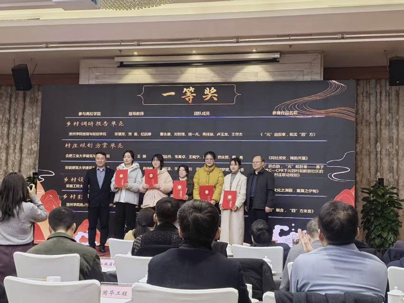 本网讯 3月3日,安徽省村镇建设学会2024年度工作会议暨学术交流活动在合肥召开,同时举行了第七届(2024年)安徽省高等院校大学生乡村规划建设方案竞赛颁奖仪式。学院建筑学专业学子虞于萱、赵月月、黄乾涛、王瑜明杰、李健强凭借参赛作品《寻洄——文化之渊薮,童真之伊甸》(指导教师李茜),荣获本次竞赛乡村设计方案单元的一等奖。