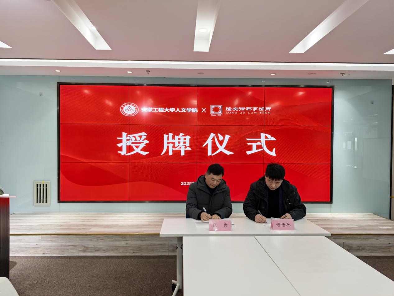 本网讯 为深入推进法学专业教育与法治实践深度融合发展,不断创新法治人才培养模式,提升学生法律实践能力,3月7日,人文学院与北京隆安(芜湖)律师事务所举行合作签约暨实习就业基地揭牌仪式。北京隆安(芜湖)律师事务所主任张徐兵,律师事务所事业合伙人徐勇、谢晋驰、叶慧明、刘冰清、周敬来,人文学院副院长张勇,法学系教师杜蓓蕾出席仪式。