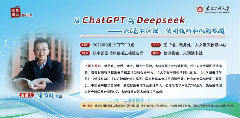 为深化师生对人工智能技术发展的认知,助力学术研究与技术应用能力提升,图书馆特邀知名专家开展科普讲座。具体安排如下: