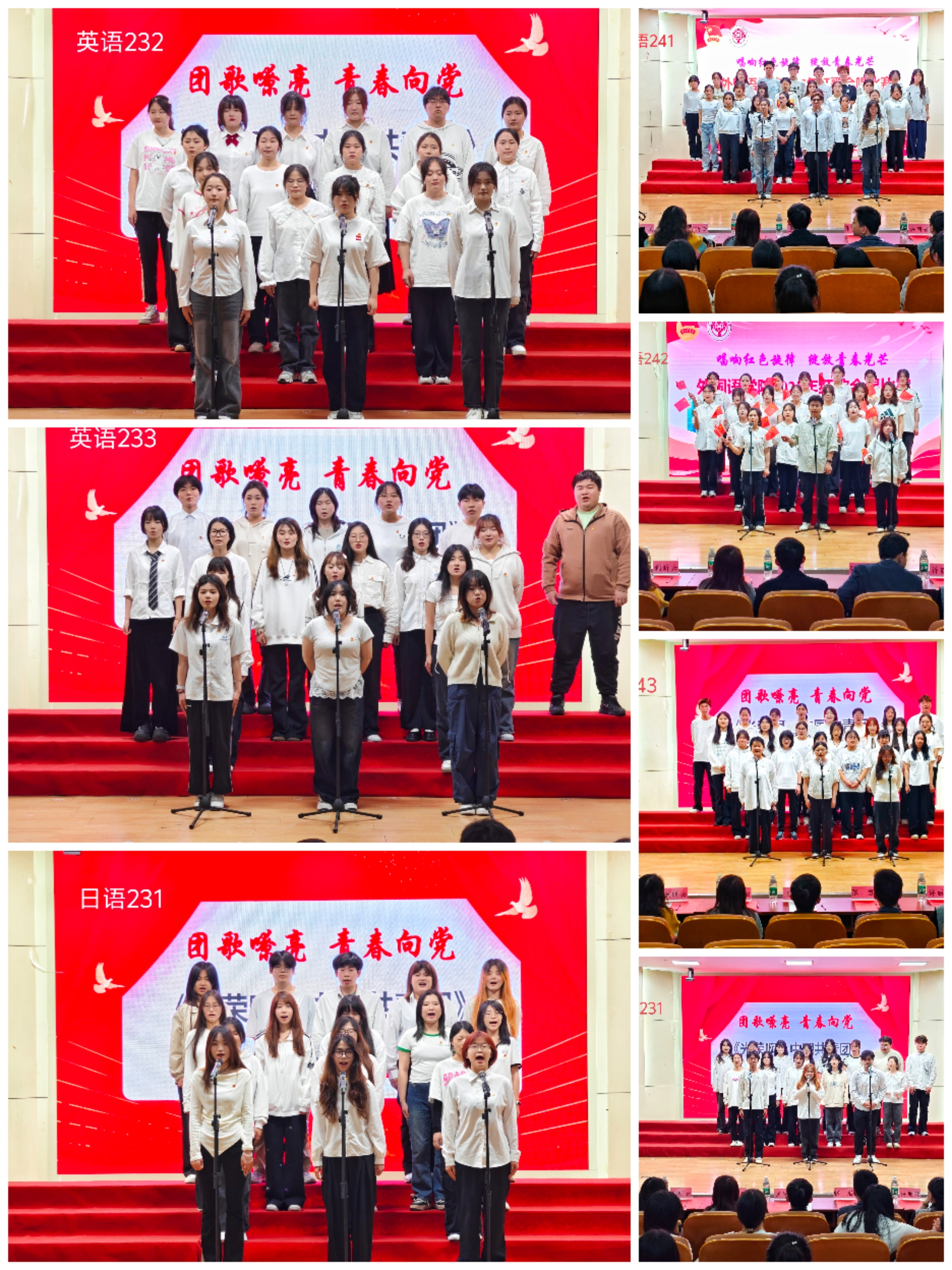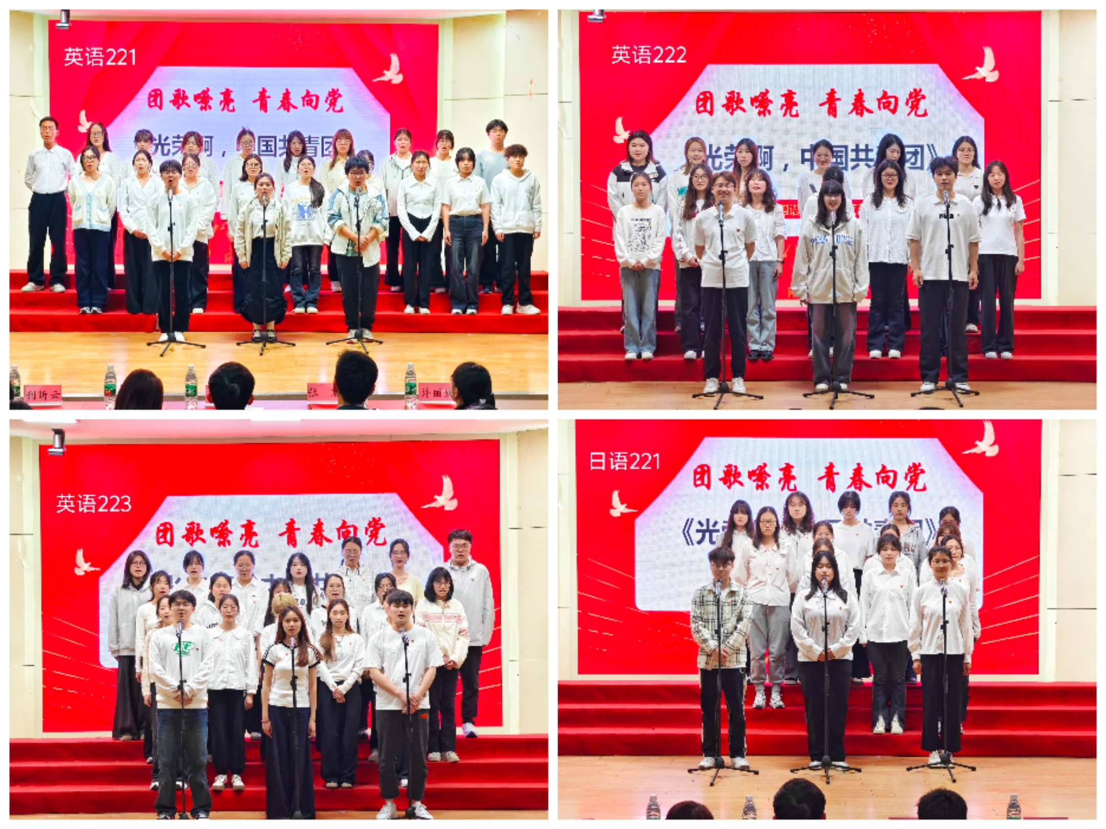比赛分为两轮,第一轮为团歌合唱环节。各团支部依次登台合唱团歌,展现青年团员的使命担当。英语241班以整齐划一的歌声率先点燃舞台,日语221班则以饱含深情的演绎传递对共青团的热爱。各团支部用嘹亮的歌声诠释“团歌嘹亮,青春向党”的主题,现场掌声此起彼伏。中场休息期间,评委组对首轮表现进行统分,观众在轻松氛围中交流互动,现场洋溢着青春与热情。