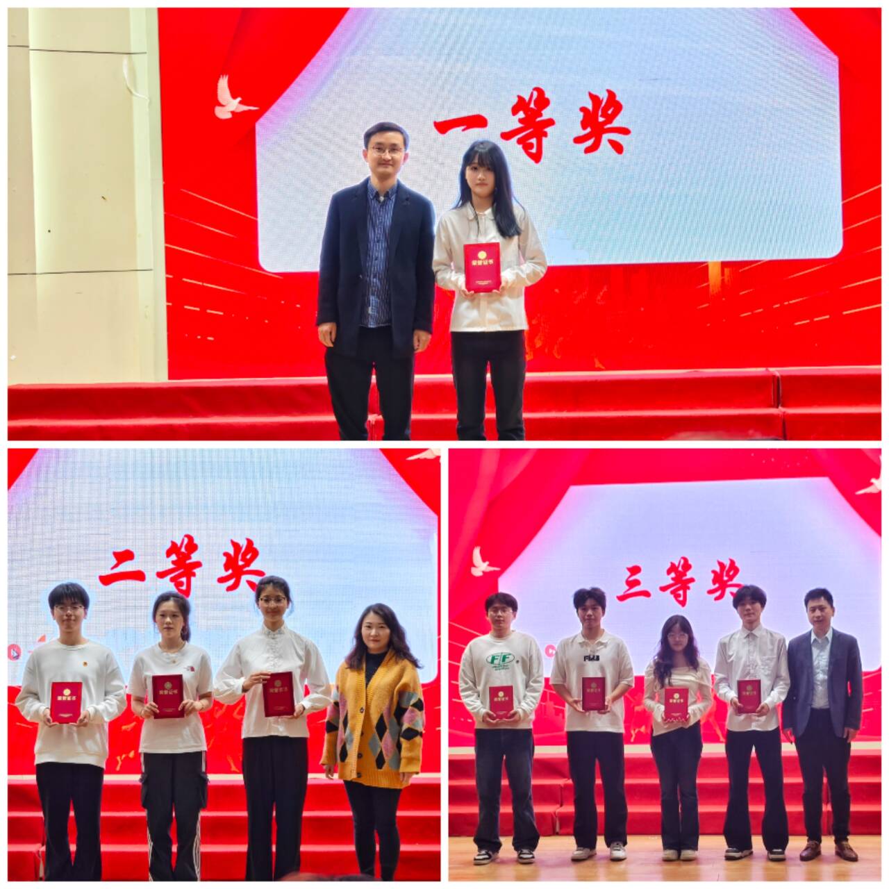 经过激烈角逐,比赛最终评选出一等奖1项、二等奖2项、三等奖4项。英语231团支部最终荣获一等奖。在激昂的颁奖音乐中,获奖团支部代表依次登台领奖。王海明、利昕云、学院团委副书记张君分别为获奖队伍颁奖并合影留念。