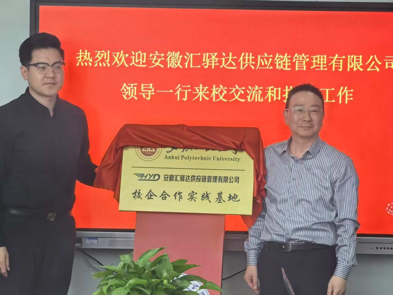 本网讯 3月26日,安徽汇驿达供应链管理有限公司(以下简称汇驿达)董事长秘书李本初和人力资源总监王涛一行四人来到经济与管理学院签订校企合作协议,并揭牌校企合作实践基地。本次签约和揭牌仪式在C座818会议室隆重举行,学院党委书记水心宝、院长龚本刚、副书记刘海涛、副院长桂云苗、物流科学系主任程永宏以及辅导员教师代表徐博参加了签约仪式。会议由桂云苗主持。
