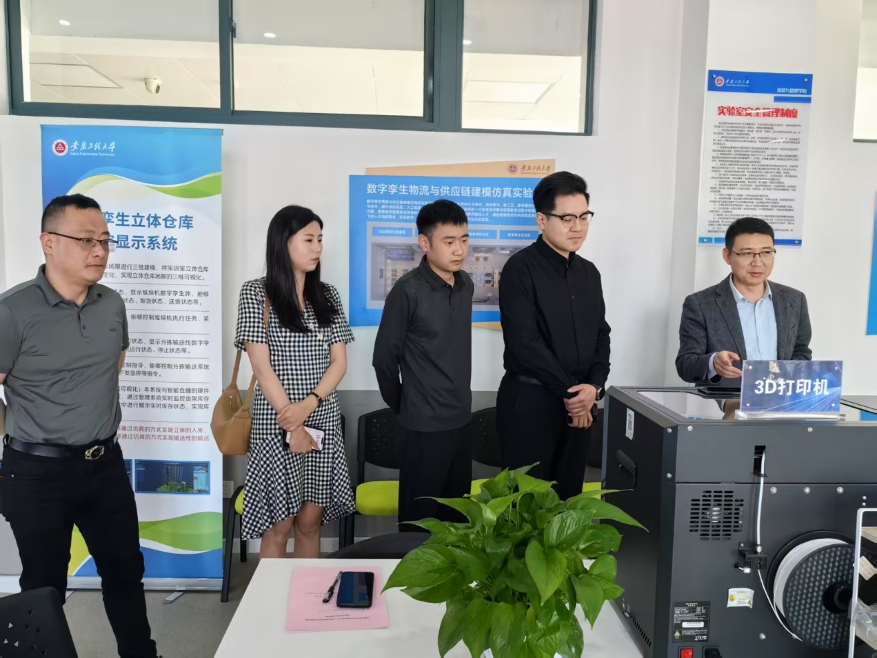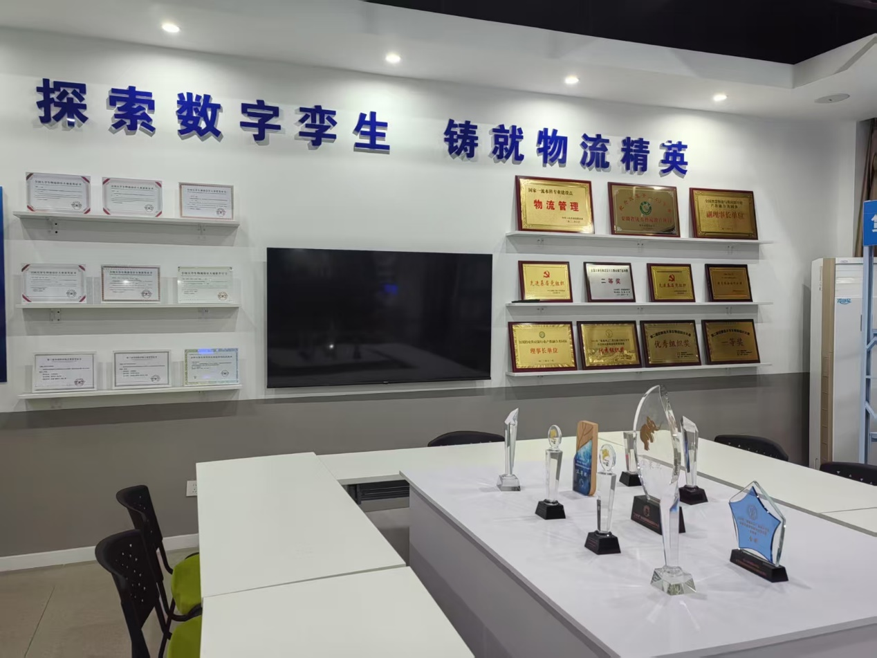 座谈会结束后,汇驿达公司一行四人参观了学院数字孪生物流与供应链仿真建模实验室,深入了解物流管理专业学生在学科竞赛和实践教学方面取得的优秀成果。