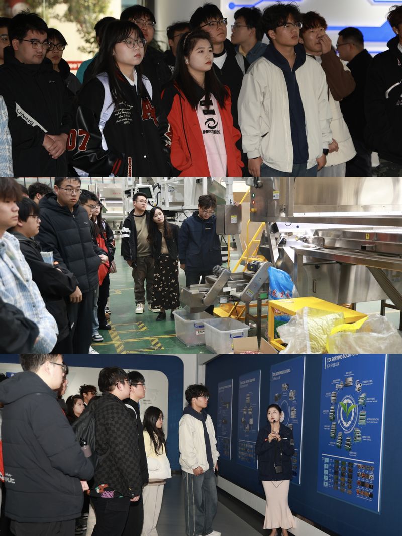 师生一行来到科大硅谷肥西园,这里作为合肥市重点打造的科技创新策源地,汇聚了设备研发、电子信息、智能制造等战略产业的新兴力量。通过参观走访,同学们对肥西县的龙头企业、高端智造业有了更加深入的了解。同学们走访了安徽中科光电色选机械有限公司、合肥市九学王教育科技有限公司、合肥元娲智能科技有限公司、安徽安利材料科技股份有限公司、安徽华晟新能源科技股份有限公司,亲身感受“中国智造”的精度与速度、体验了AI赋能教育的创新实践、领略了AIGC影视创作解决方案和对内容产业变革的推动作用。通过产品展示和智能车间的切身体验,直观认识到合成革材料在各个领域的广泛应用,见识到全球领先的新一代异质结太阳能电池的创新发展,感受到“双碳”战略下中国新能源产业的蓬勃活力。