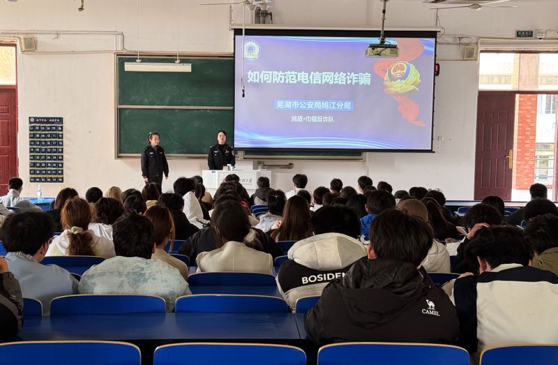 本网讯 为切实增强学生防范电信网络诈骗的意识,提升校园安全水平,化环学院联合校安全管理处于4月2日在6教215举办了以“防诈反诈 安全同行”为主题的防诈骗安全教育专题讲座。本次讲座特邀芜湖市公安局鸠江分局鸠盾·巾帼反诈队队长姚璐璐警官,芜湖市公安局鸠江分局鸠盾·巾帼反诈队王云杉警官主讲,校安全管理处相关人员、学院辅导员以及各班级本科生代表参加了此次讲座。