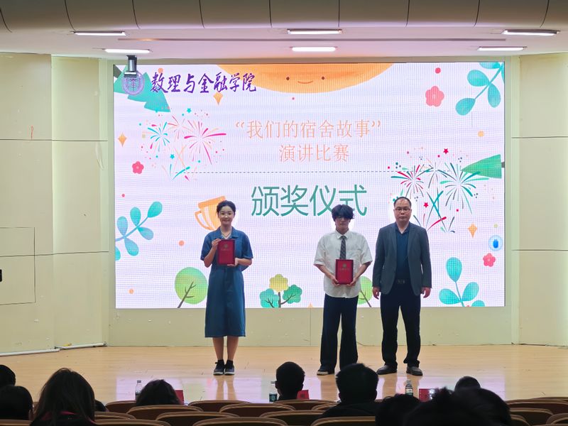 本网讯 为推动广大同学积极投身宿舍建设,营造和谐的宿舍育人氛围,4月9日,数理与金融学院在学术报告厅举办“我们的宿舍故事”演讲比赛,来自各学院的12名学生入围决赛。马克思主义学院王明、数理与金融学院江政、第一届“我们的宿舍故事”演讲比赛一等奖获得者刘书文担任评委,数理与金融学院党委副书记何志恒、团委书记及200余名学生代表观摩比赛。