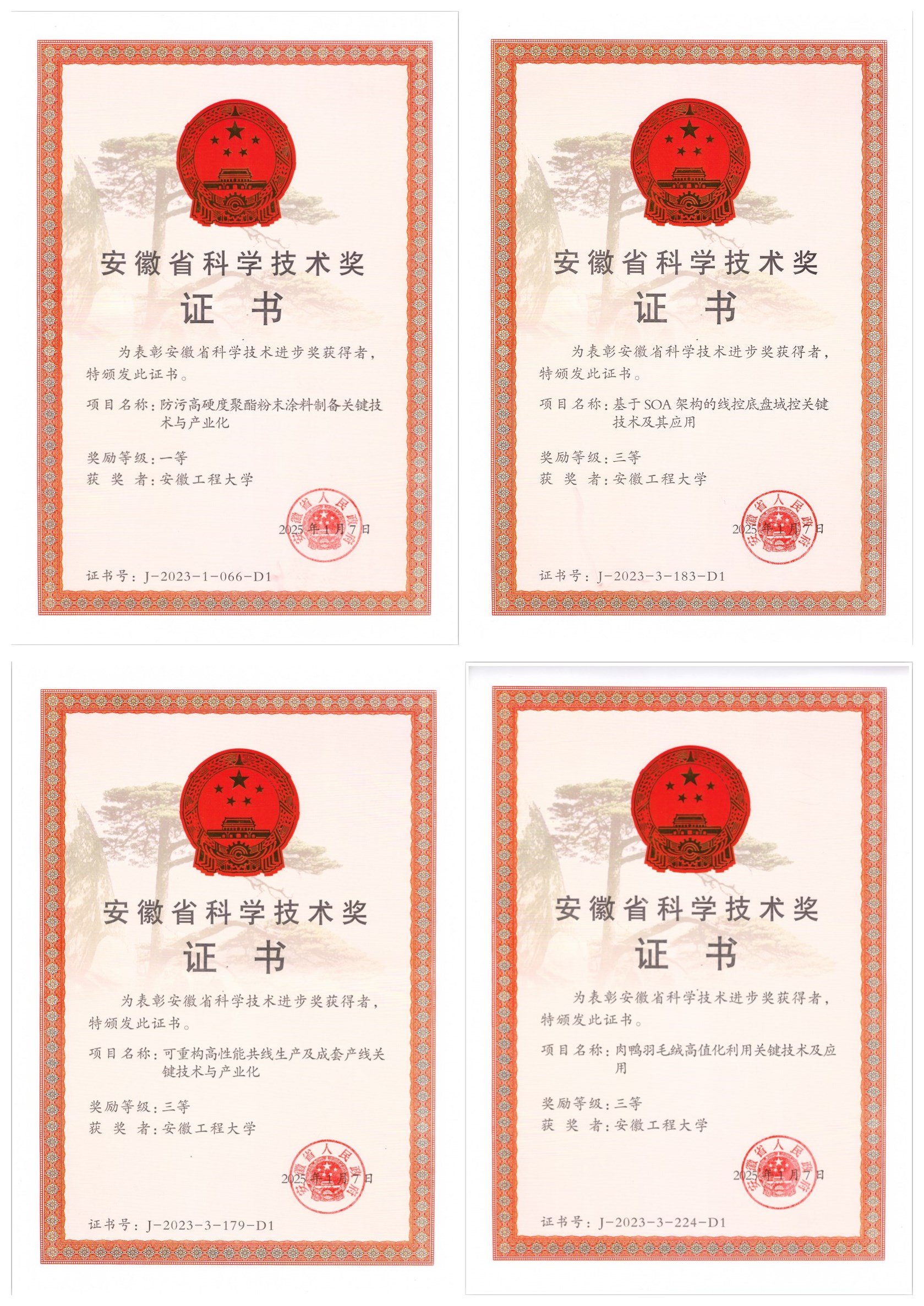 “防污高硬度聚酯粉末涂料制备关键技术与产业化”项目系我校王宗乾教授团队联合安徽神剑新材料等单位联合提出,针对国内粉末涂料存在的硬度低、耐磨性差、易玷污且使用寿命短等共性难题,创新设计并开发了高硬度硅系聚酯树脂和聚二甲基硅氧烷改性聚异氰酸酯超滑树脂,研制了涂层硬度达8H且具有优异自清洁功能的粉末涂料,产品综合性能赶超国内外同类产品,在轨道交通、工程机械等多个领域替代了国外进口,项目获得安徽省科技进步奖一等奖。另外,陈孟元教授团队的“可重构高性能共线生产及成套产线关键技术与产业化”项目、时培成教授团队的“基于SOA架构的线控底盘域控关键技术及其应用”项目以及刘新华教授团队的“肉鸭羽毛绒高值化利用关键技术及应用”项目获得安徽省科技进步奖三等奖。