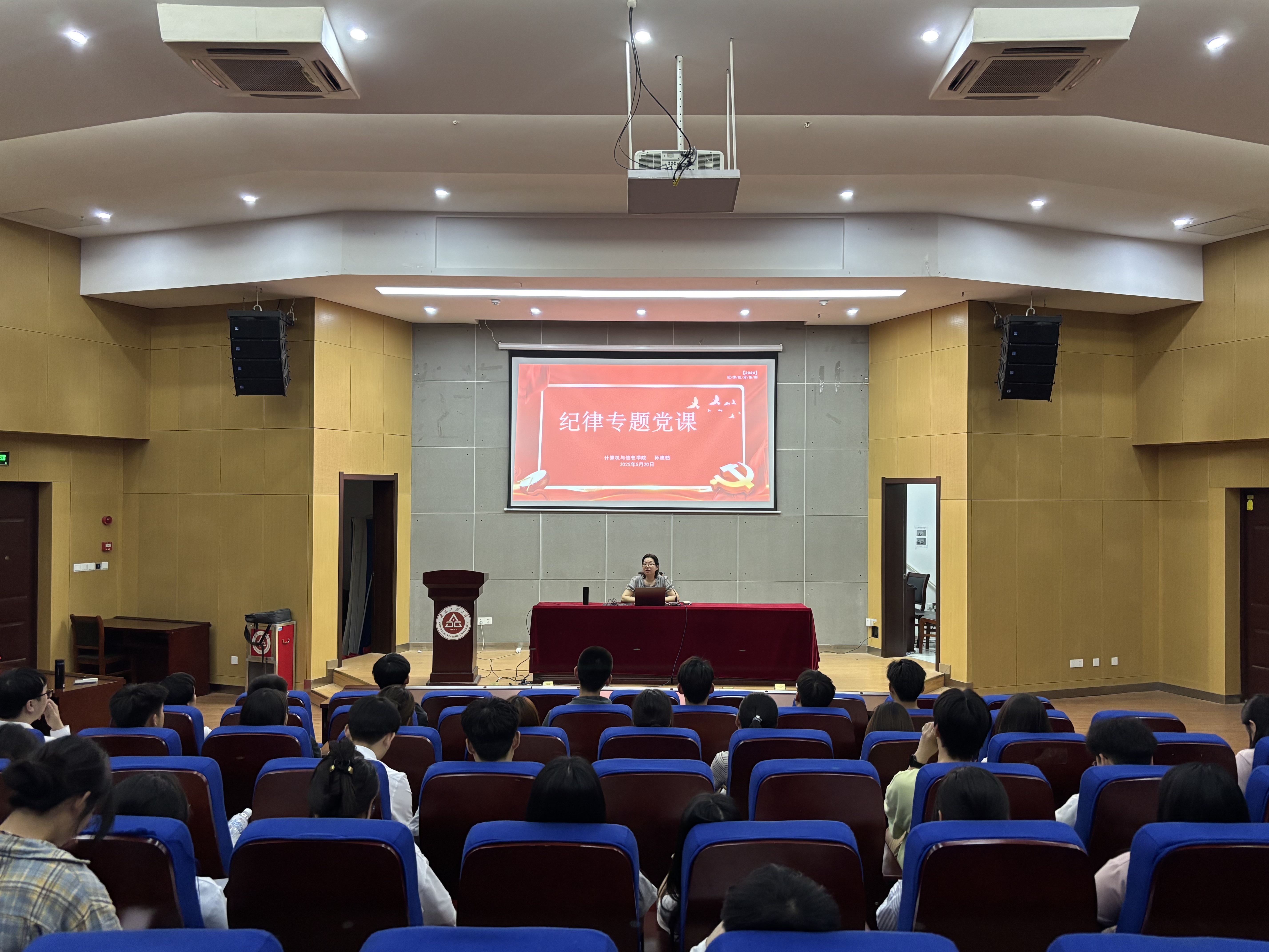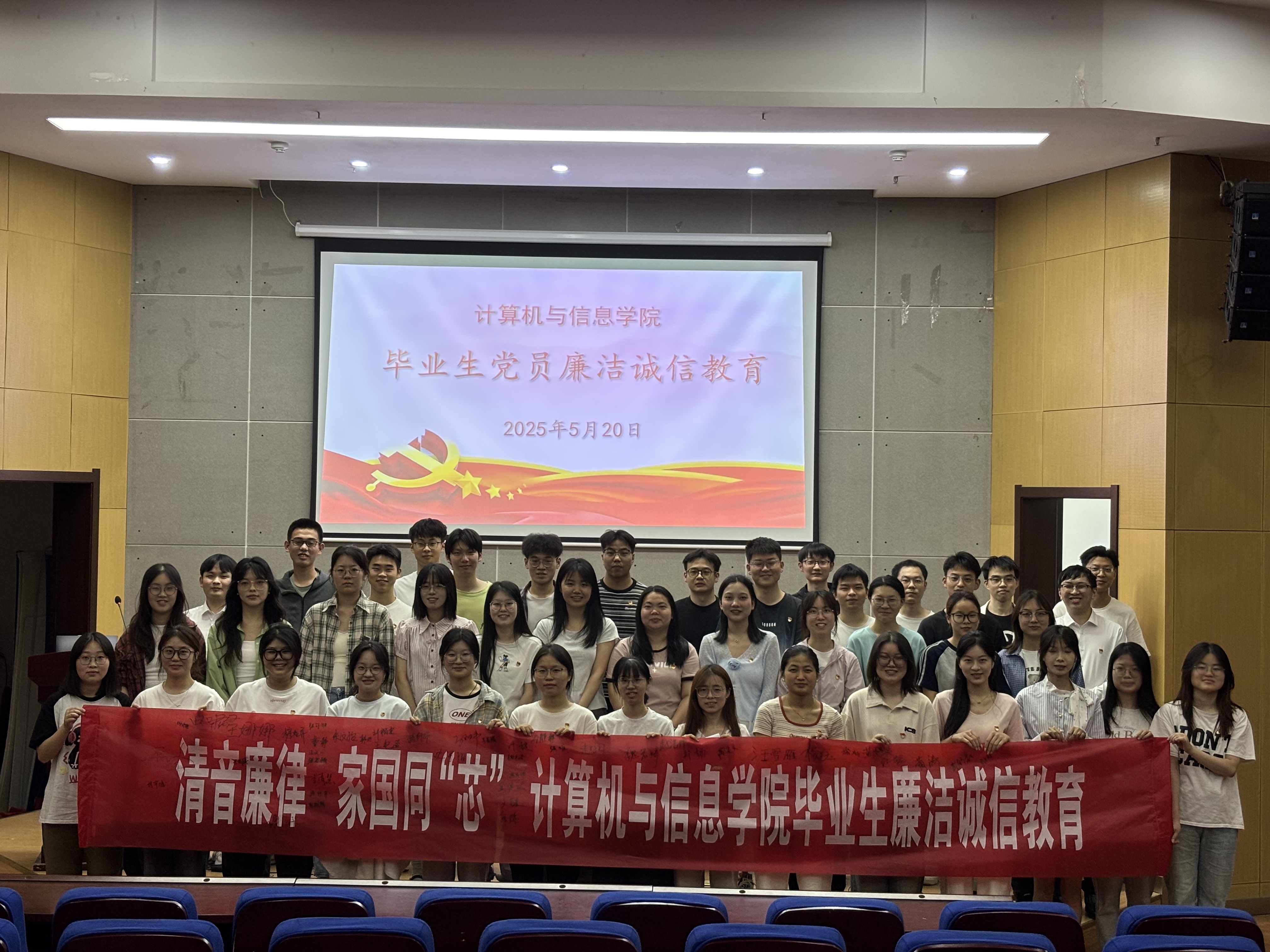 本网讯 5月20日,计算机与信息学院开展毕业生党员廉洁诚信教育活动。本次活动以“清音廉律·家国同‘芯’”为主题,通过微党课比赛、重温入党誓词、专题党课等形式,为毕业生党员上好廉洁诚信“最后一课”。学院党委副书记、纪委书记孙德茹、辅导员代表和毕业生党员参加活动。