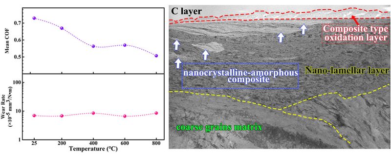 这项研究聚焦于共晶高熵合金在25-800℃宽温域范围内的摩擦行为和磨损机制。研究发现,在摩擦热和环境热的作用下,摩擦引起的氧化作用在表面诱导形成一层具有保护作用的纳米晶-非晶复合氧化层,该复合层具有高强度,并能协调变形,降低应变集中,延缓微裂纹的聚合与扩展,降低了材料的磨损率。随着温度增加,摩擦和氧化的综合作用导致氧化层的厚度增加,有效保护共晶高熵合金的内部。在800℃时,高温促进了原子的扩散,使非晶态氧化层发生部分结晶,形成纳米和超细晶粒。新形成的纳米晶粒和超细晶粒热稳定,具有较高的硬度,提高了合金的抗磨性能。这一研究成果也为后续共晶高熵合金在航空航天、汽车制造、机械工程等对材料摩擦性能要求苛刻的领域的应用提供了重要的理论支撑。