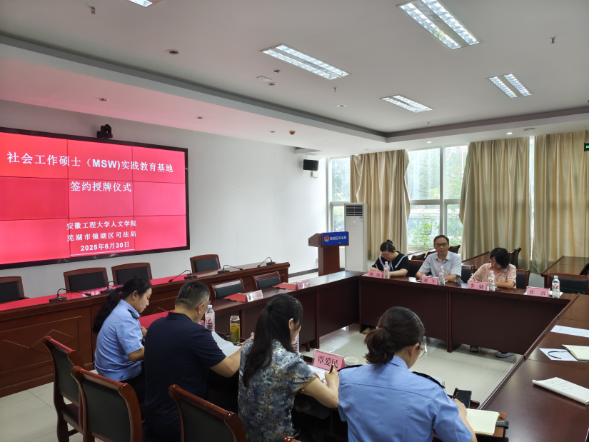 本网讯 6月30日,人文学院与芜湖市镜湖区社区矫正管理局举行社会工作(MSW)研究生实践教学基地签约揭牌仪式。镜湖区副区长覃爱民,区司法局党组书记、局长胡文勇,区社区矫正管理局负责人张修林,人文学院院长刘军、研究生秘书李婕及部分导师代表参加仪式,区司法局副局长黄静主持活动。