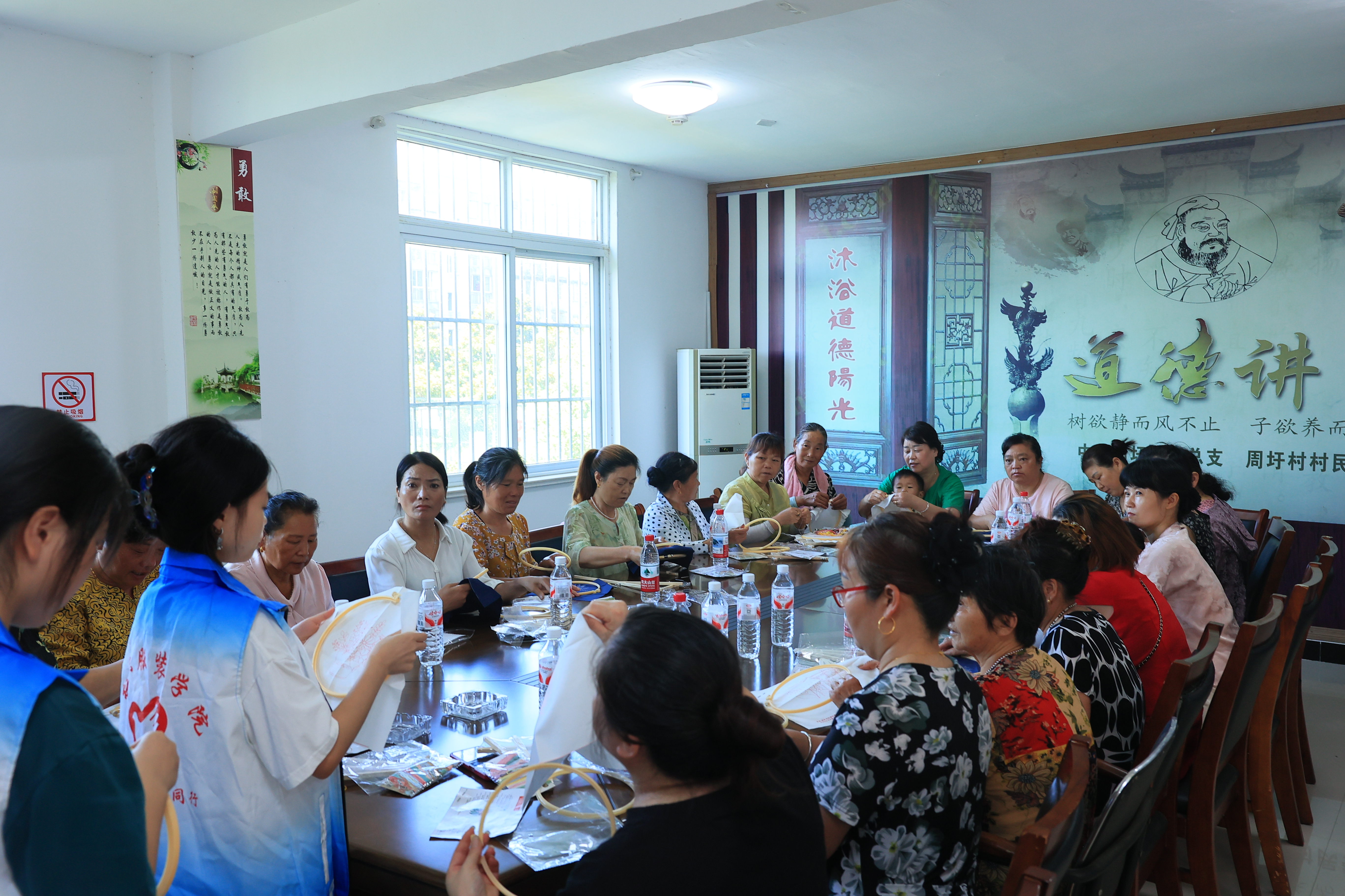 在周圩村、强桥村,实践团队以“非遗进乡村”为主题,开展刺绣技艺培训和“捶草印花”非遗体验活动。纺织教师党支部教师党员现场演示传统刺绣针法,指导村民制作具有地域特色的纹样作品;服装学生党支部学生党员则带领儿童体验“捶草印花”工艺,将天然植物叶片与棉麻布料结合,创作出兼具生态美与文化韵味的方巾、布包等文创产品。在中窑村党群服务中心纺织学生党支部设立“天安门主题摄影棚”,为60余位村民拍摄纪念写真。师生精心布置天安门城楼背景板,并赠送装裱好的照片。82岁的周爷爷激动地说:“年轻时想去北京看升旗,今天终于在照片里圆了梦!”活动还为行动不便的老人提供上门拍摄服务,用镜头传递温暖与关怀。在周圩村新时代文明实践站,实践团队邀请校纪委副书记郭广春讲授“七一”专题党课。讲座通过“精神领学+理论讲解+案例分析+实践延伸”的形式,用通俗语言阐释作风建设的重要性,并结合周圩村的具体实际分析了和美乡村建设的重点工作。村党总支书记表示:“这种‘理论+身边事’的宣讲方式,让干部群众听得懂、记得住,对推进清廉村居建设很有帮助。”