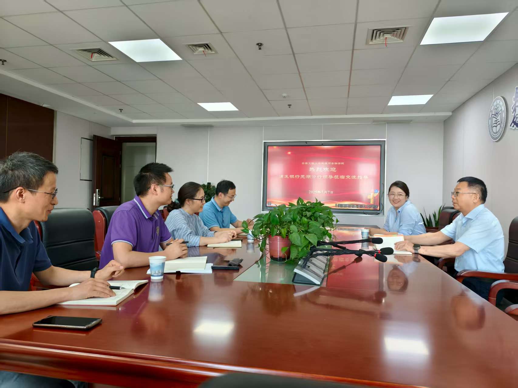本网讯 7月7日,浦发银行芜湖分行党委书记、行长魏翔鸿、办公室主任刘芸到访数理与金融学院,就进一步深化校企合作事宜开展专题调研。学院党委书记彭海燕、院长吴小太、副院长张培雨及相关专业负责人参加座谈。