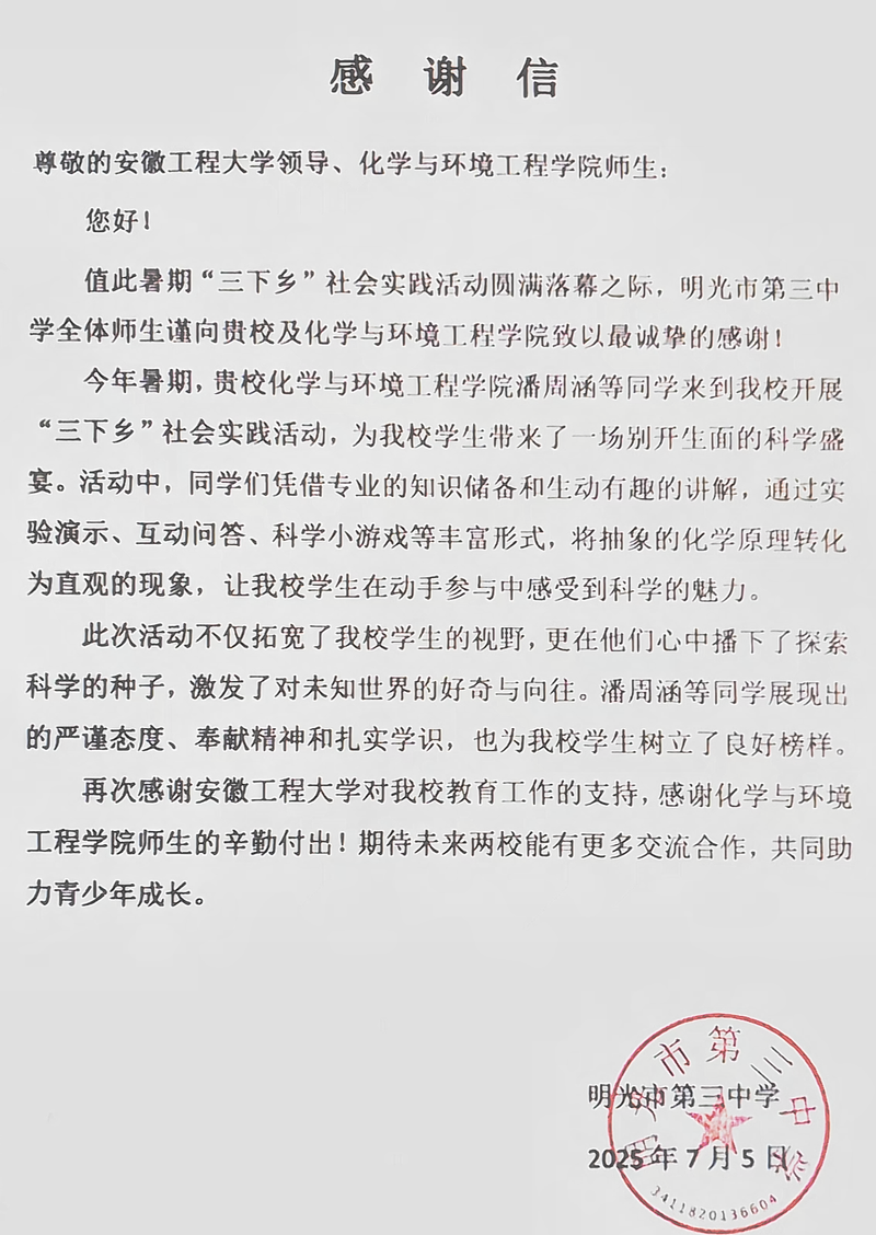 本网讯 近日,化学与环境工程学院“鲁诺生辉,桑梓化钧”暑期“三下乡”社会实践团队收到安徽省明光市第三中学发来的感谢信,信中对团队成员回归母校开展的“鲁诺生辉,桑梓化钧”社会实践活动给予高度评价。