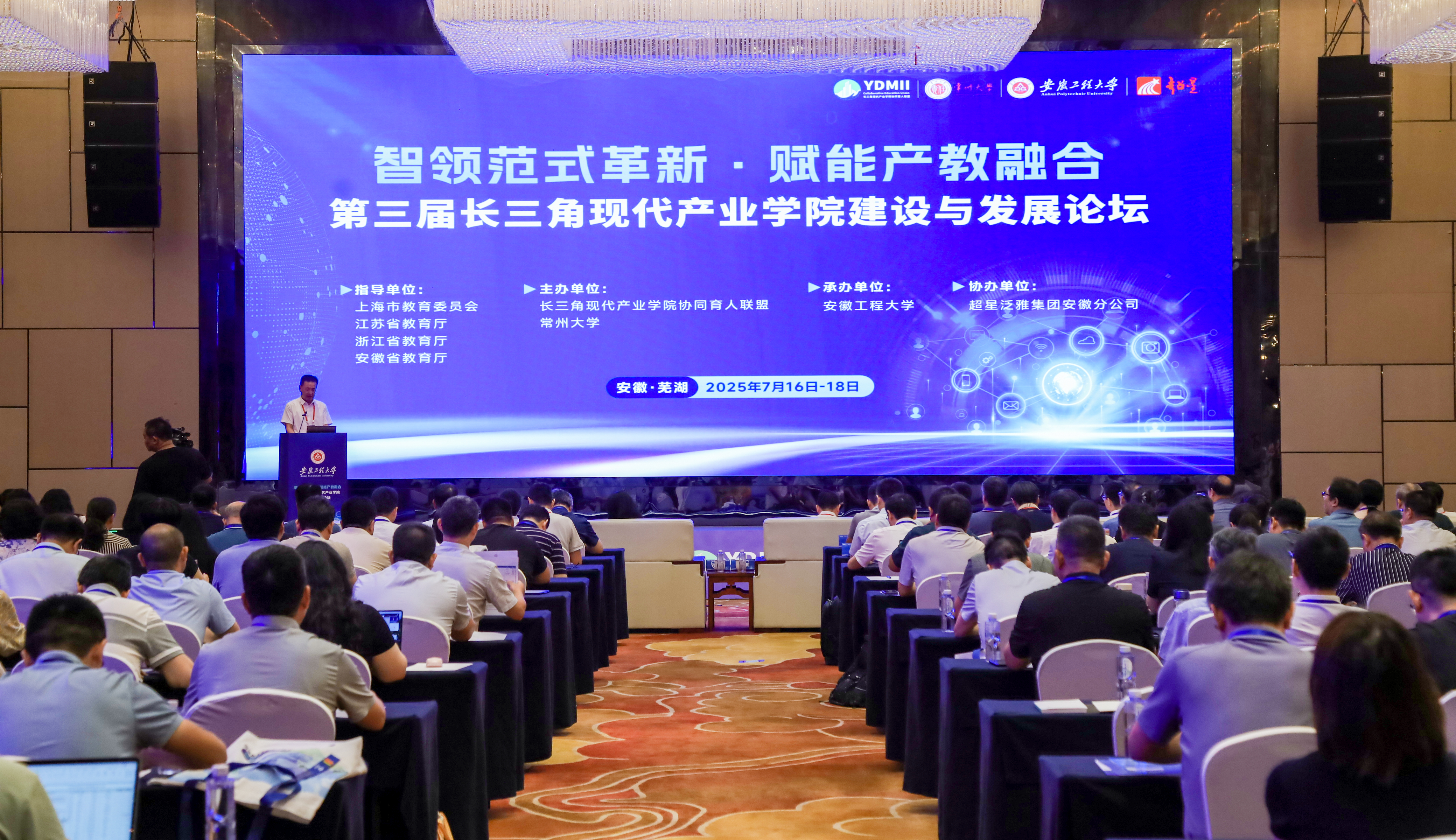 本网讯 7月16日至18日,由长三角现代产业学院协同育人联盟等主办、我校承办的第三届长三角现代产业学院建设与发展论坛在芜湖举行,本届论坛的主题为“智领范式革新·赋能产教融合”。来自长三角三省一市的高校、专家和企业家代表共计300余人齐聚一堂,共同探索在人工智能时代现代产业学院产教融合新路径。