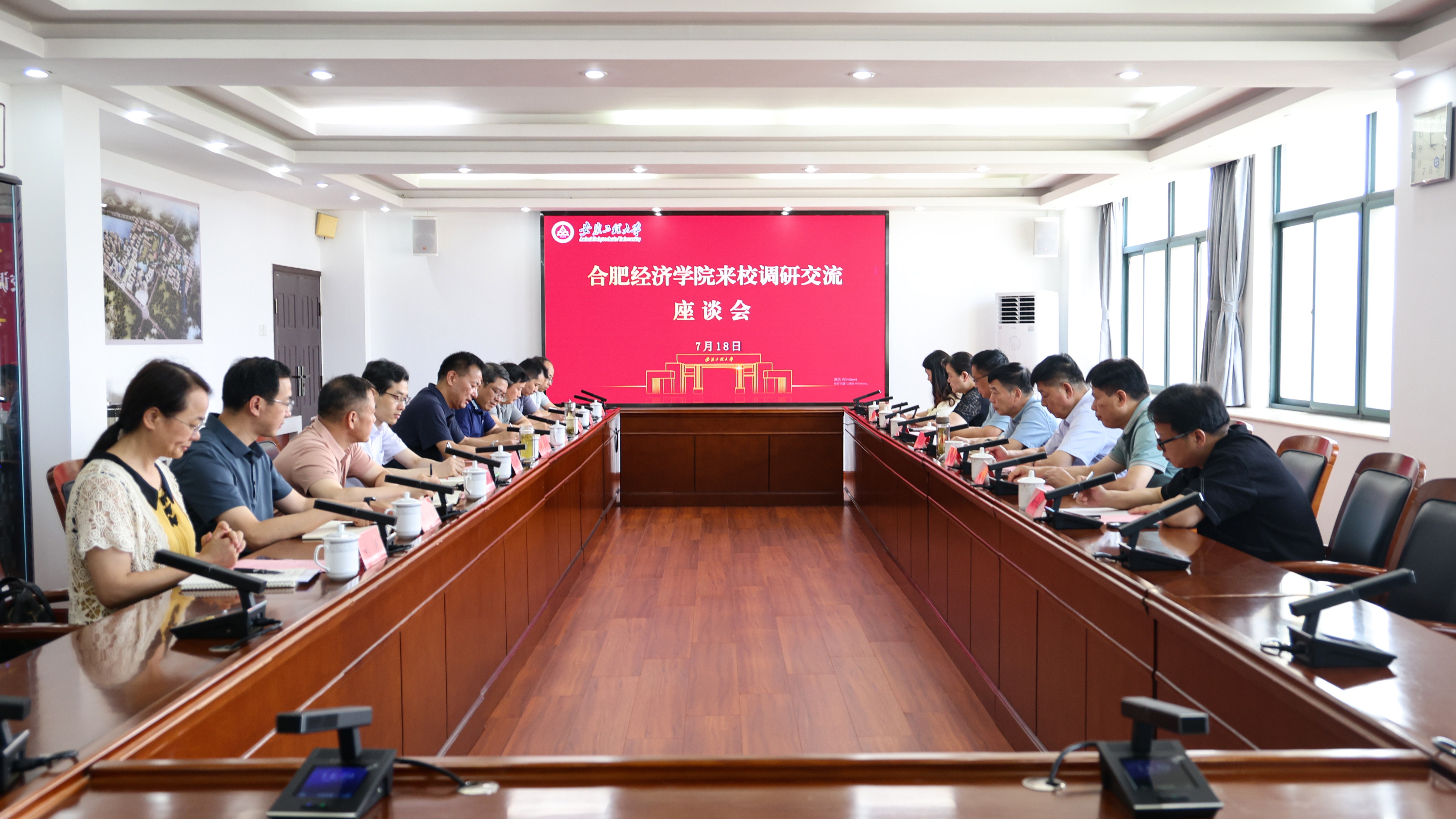 本网讯 7月18日,合肥经济学院党委副书记、校长刘宁,常务副校长郭亮一行来我校调研交流。校党委副书记、校长黄友锐主持召开座谈会,副校长王成军,相关职能部门和二级学院负责人参加座谈会。