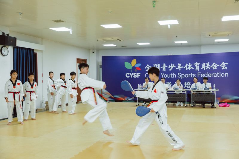 本网讯 安徽省2025年青少年跆拳道文化技术暨黑带培训营于7月20日在我校举行,本次公益活动由我校体育学院与全国青少年体育联合会安徽推广委员会等单位联合举办,共有来自省内各县区218人参加培训。