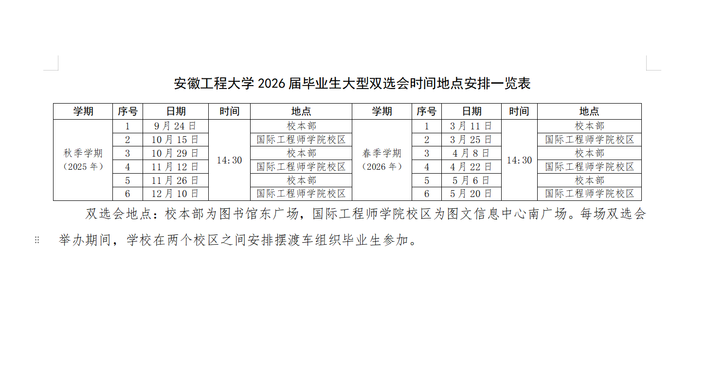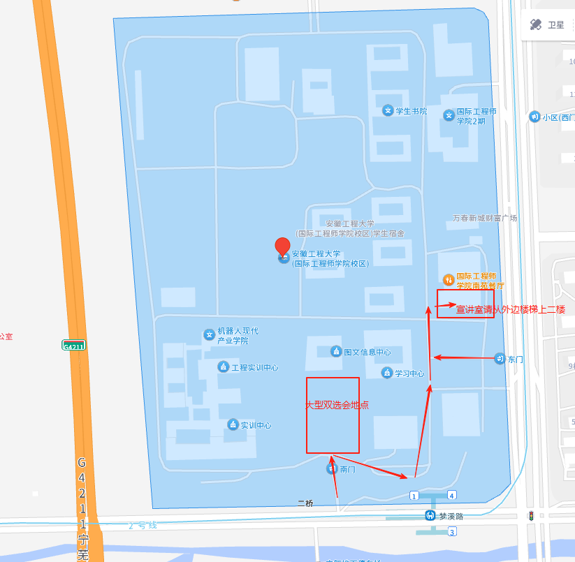 校园招聘活动在校本部和国际工程师学院校区均会开展,校本部位于芜湖市北京中路,国际工程师学院校区位于芜湖市赤铸山路与梦溪路交汇处,两校区之间间隔10公里左右。