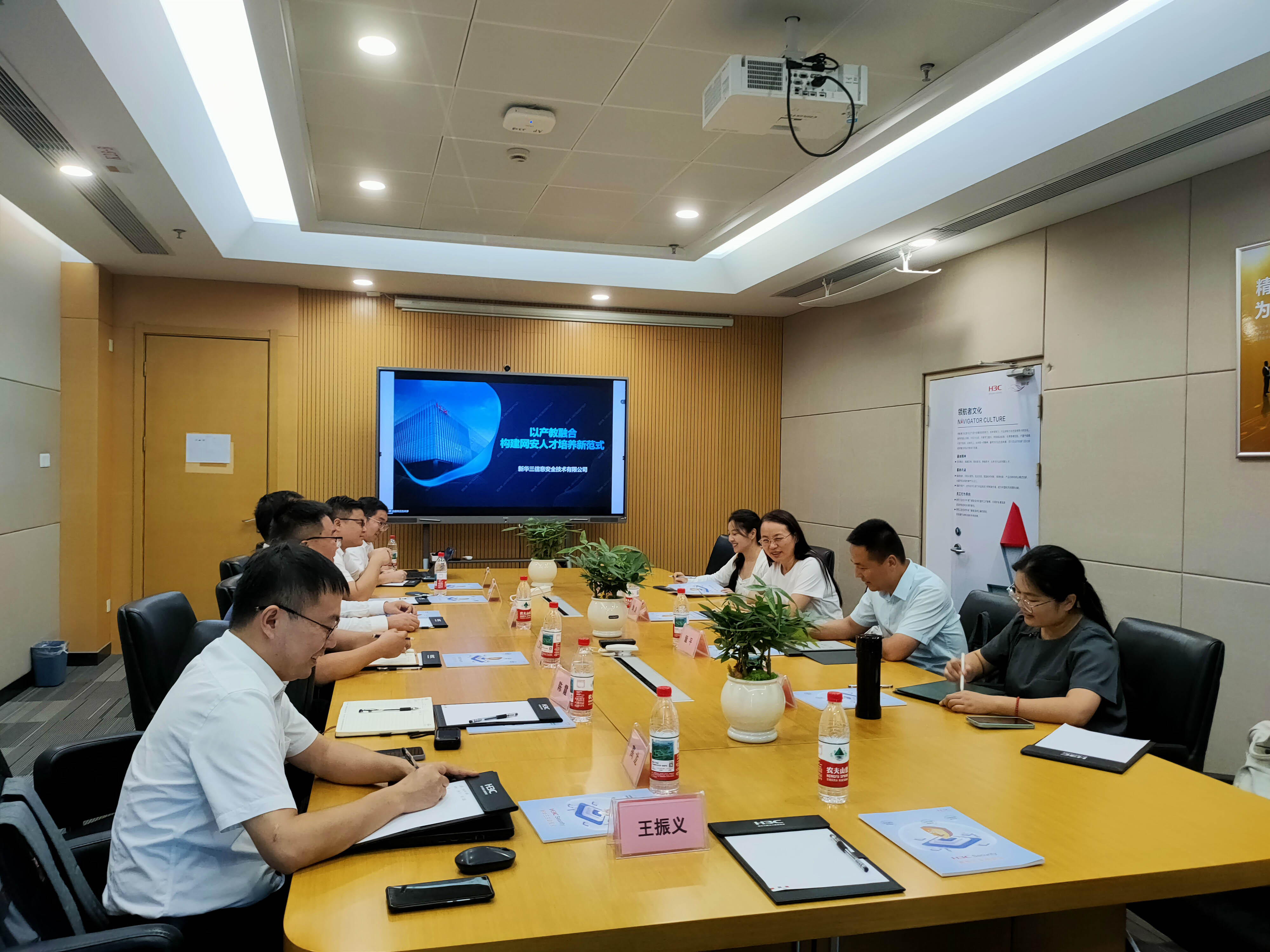 本网讯 9月5日,计算机与信息学院副院长刘涛、物联网工程系主任章平一行四人,前往新华三集团开展物联网工程专业安全方向课程体系与人才需求调研。新华三集团产教融合部总监周旭东、产教融合解决方案部部长金鹏伟等相关负责人与数字奇安公司代表一起热情接待并参与交流。