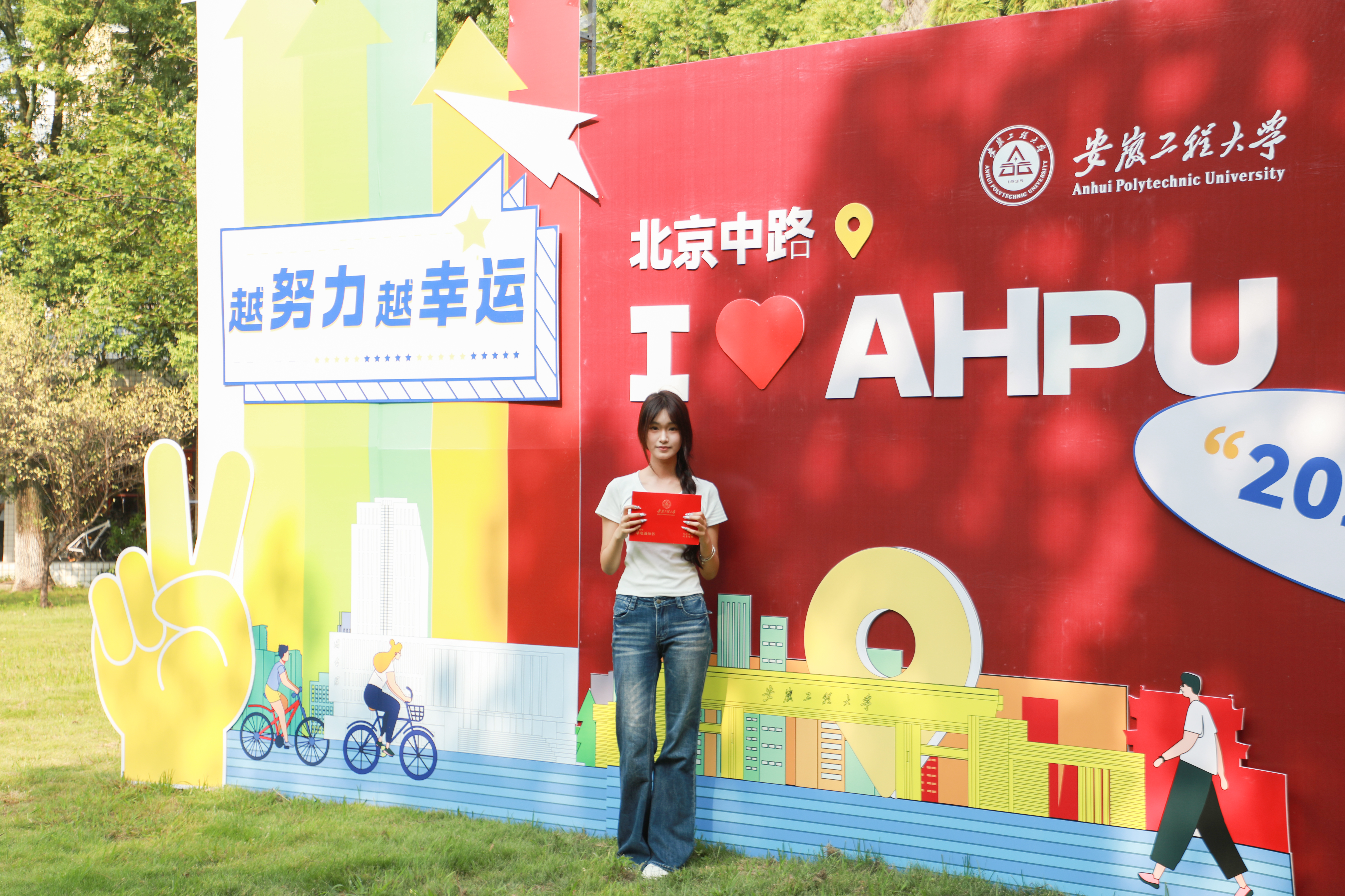 动画252班的曾雯在迎新展板前,捧起录取通知书拍下了她与学校的第一张合影。她兴奋地说:“来到学校后,发现学校比我想象中的还要大,让我非常期待探索校园里的更多角落。在新的阶段,我会在学习中坚持自己的爱好,成为更好的自己!”