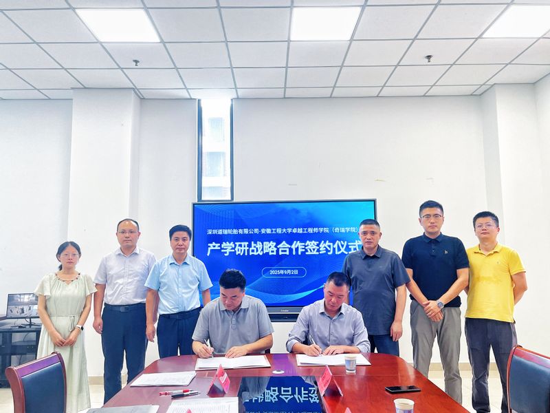 本网讯 9月2日,卓越工程师学院(奇瑞学院)与深圳道瑞轮胎有限公司产学研签约仪式在国际工程师学院校区协同中心举行。深圳道瑞轮胎有限公司执行总裁易昊、华东区域销售总经理张俊、安徽区域总经理孙成,院党委副书记周伟、执行院长王建平出席签约仪式。签约仪式由周伟主持。