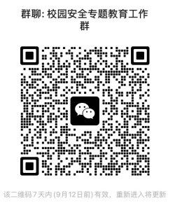 各学院可结合入学教育,在军训期间同步开展相关活动,也可于国庆节后通过主题班会、专题讲座等形式进行。请各学院于9月10日前指定一名负责人,并扫描附件中“校园安全专题教育工作群”二维码加入群组,以便后续协调与通知。