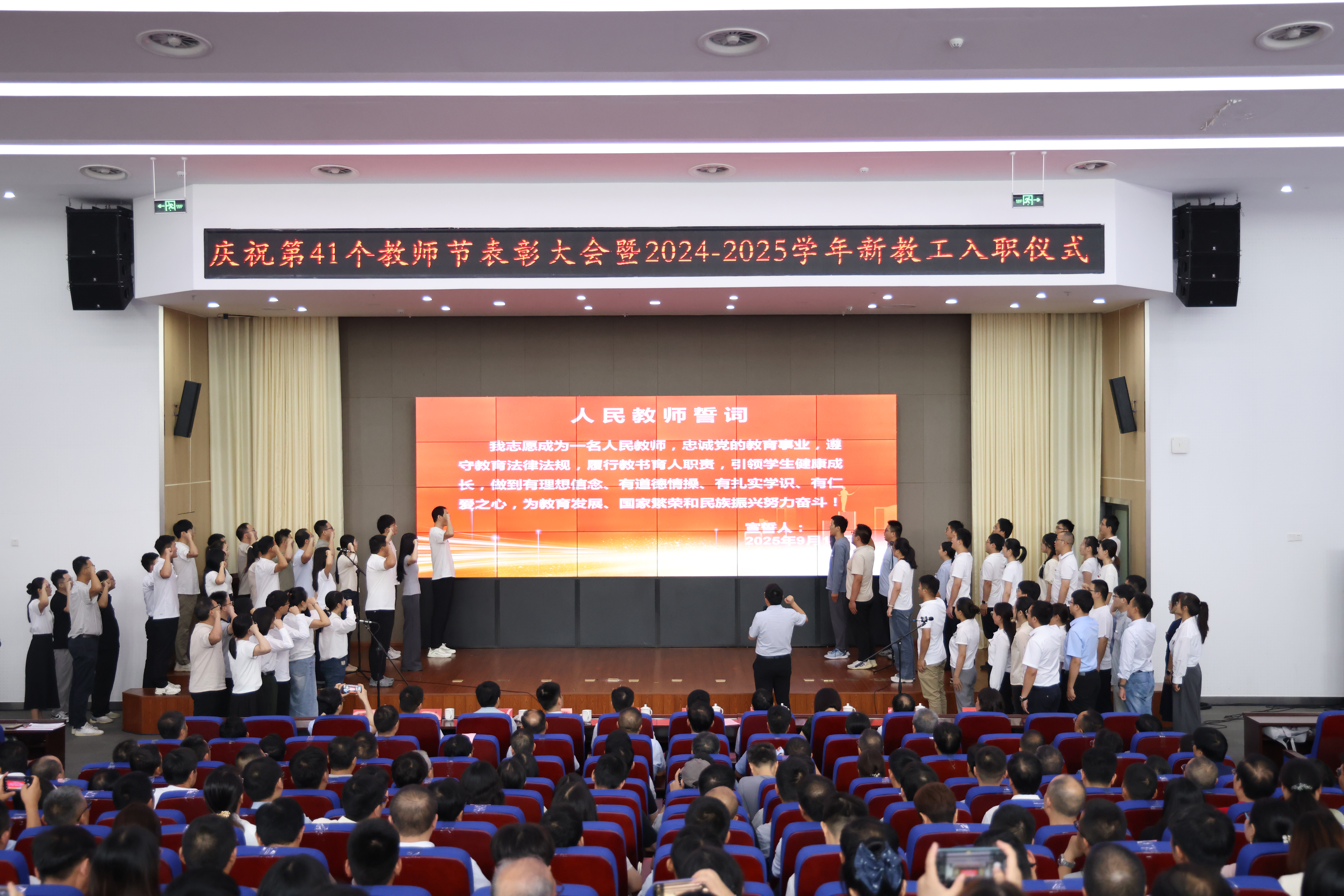 本网讯 9月10日,学校在图书综合楼5楼会议室举行庆祝第41个教师节表彰大会暨新教工入职仪式。校领导卢平、郑健、程双四、凤权、周虹屏、张开炳、王成军出席。相关职能部门、各二级单位主要负责人,受表彰教职工,全体新进教职工,离退休老同志和师生代表共计400余人参加。