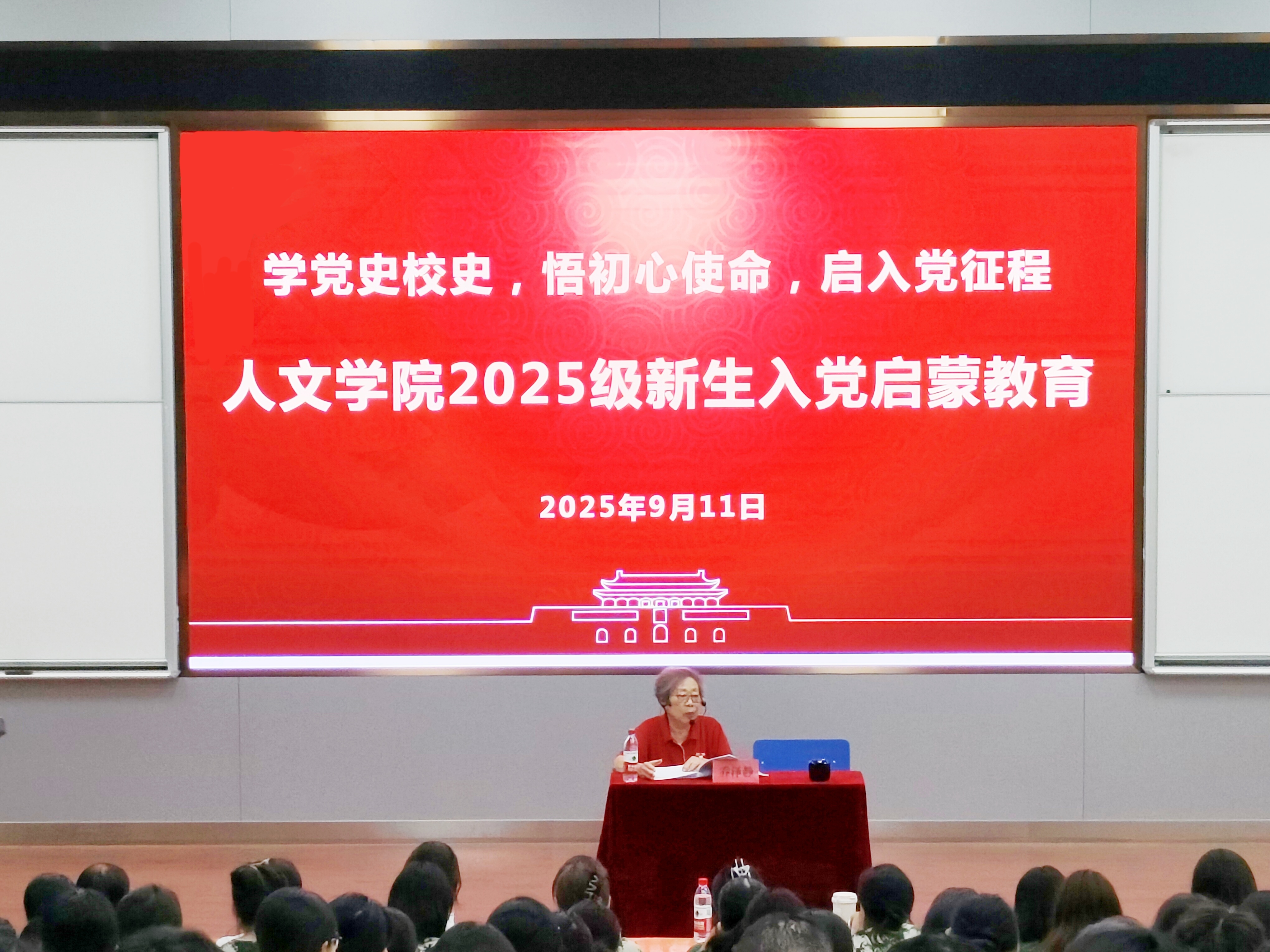 本网讯 9月11日,人文学院面向全体新生开展以“学党史校史,悟初心使命,启入党征程”为主题的入党启蒙教育活动,为新生们开启了一堂兼具思想深度与情感温度的“初心第一课”。我校离退休党委委员、原体育学院党总支书记乔泽静,人文学院党委副书记余本祺出席活动。