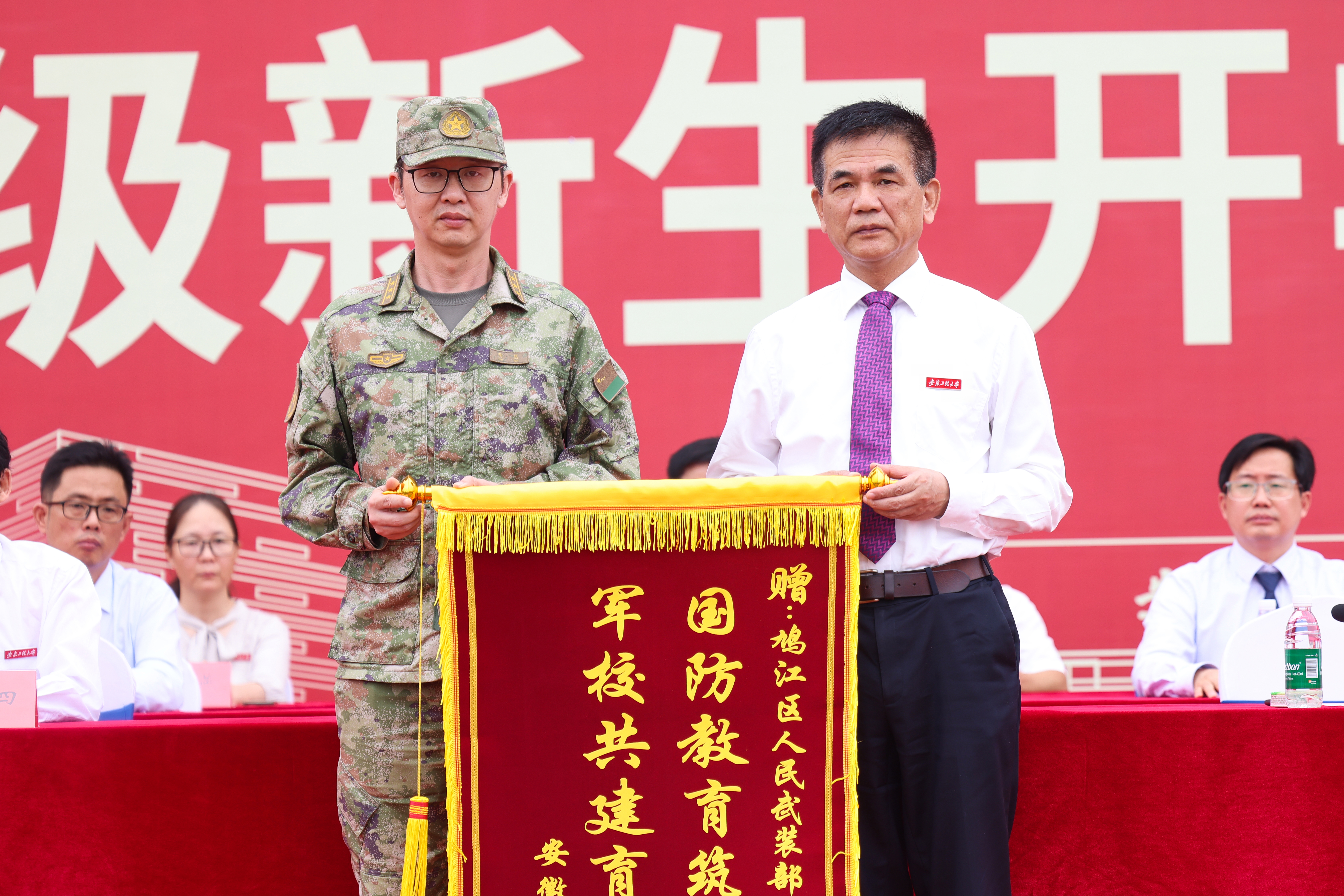 校党委书记卢平代表学校向军训指导单位鸠江区人武部赠送锦旗。