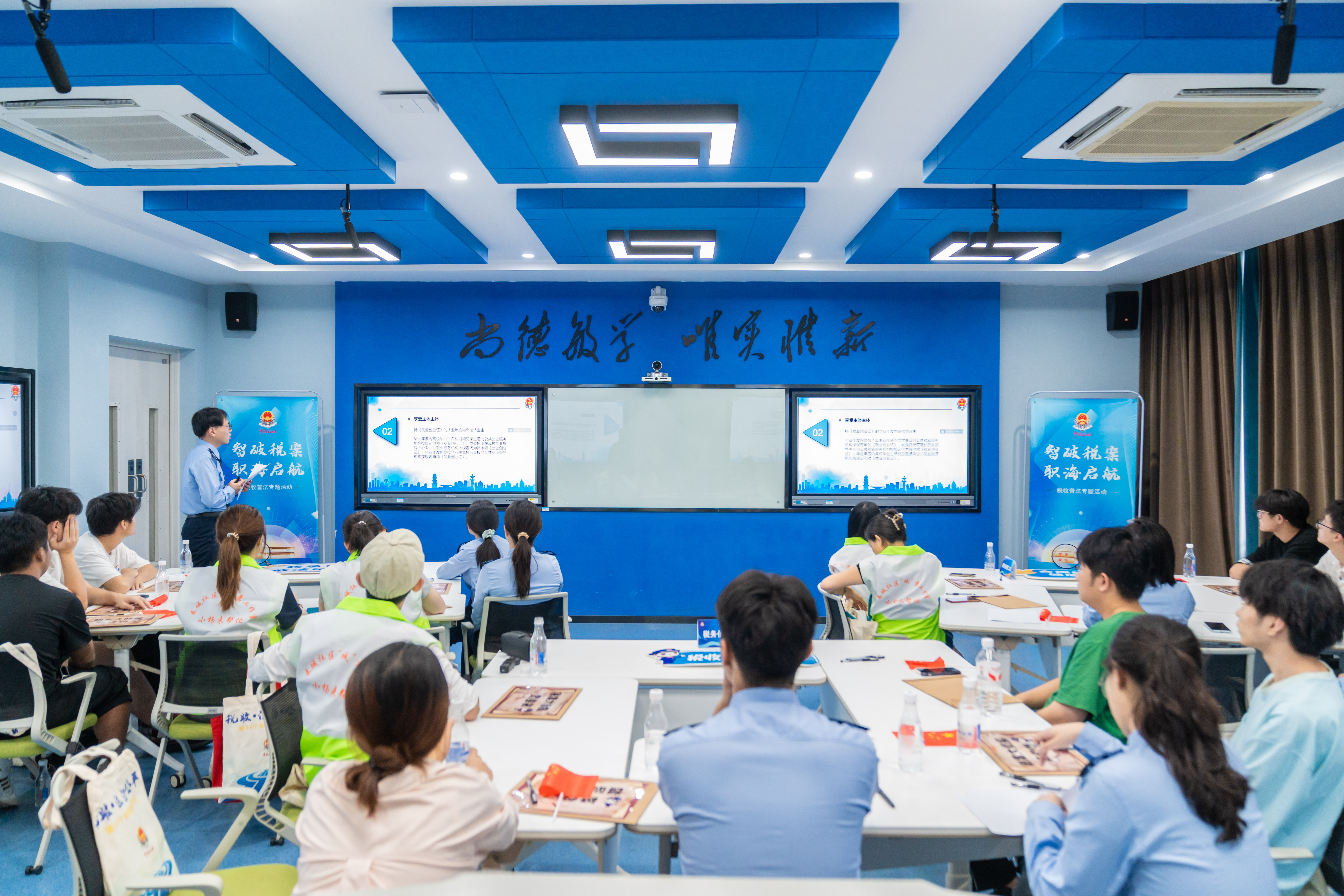 税韵相伴,普法入心。活动特别设计了“智破税案,职海启航”趣味闯关赛,将税收知识巧妙融入情景探案。税务人员、社区工作者和同学们混合编队,化身“税务侦探”,在合作解谜中学习政策法规。现场互动频频,税法知识在轻松氛围中深入人心。