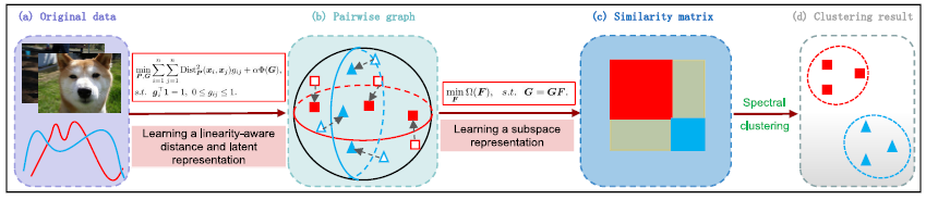 (基于度量学习的子空间聚类框架旨在通过度量学习来学习线性结构的特征表示)
