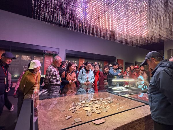 在讲解员引导下,老同志们走进凌家滩遗址博物馆,开启文化寻根之旅。大家循着“鉴往知远”“玉耀长河”“文明互鉴”三大展区脉络,沉浸式观摩了双面圆雕玉龙、八角星纹玉鹰及各式玉人、陶器、石器等珍贵文物,认真聆听讲解员讲述文物背后承载的史前文明故事,感受中华历史的厚重与文化的深邃。