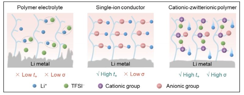 题为“Cationic–Zwitterionic Polymer Electrolytes with Enhanced Ionic Conductivity and Lithium-Ion Selectivity for Solid-State Batteries”的论文,聚焦一类阳离子–两性离子聚合物电解质,兼具高离子电导率与增强的锂离子选择性。体系通过阳离子链段固定阴离子以促进选择性锂离子传输,磺酸基团则促进盐解离与离子迁移。结构与电化学测试表明,该电解质在锂对称电池与Li||LiFePO4电池中表现出优异稳定性与循环性能;基于高载量正极的1.2 Ah软包电池验证了其可扩展性与安全性,展现出在下一代固态锂金属电池中的应用前景。