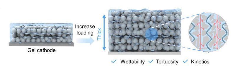 题为“High-Loading Gel Cathodes Enabling Energetic Zinc Metal Batteries with Device-Level Capacities Beyond 100 Ah L-1”的论文,提出用于构建高性能锌电池的凝胶正极(Gel Cathode)策略。该策略以电解质为聚合介质,显著提升电极润湿性;聚合物骨架自组装形成连通孔道的三维凝胶网络,降低离子传输曲折度并缩短扩散距离。凝胶基质同时具备良好力学稳定性,可在循环中缓解体积变化应力、抑制活性物质脱落与结构破坏。所制备正极实现67.8 mg cm-2的活性物质负载量,全电池体积容量达到120 Ah L-1,处于当前研究领先水平。