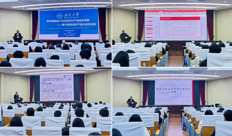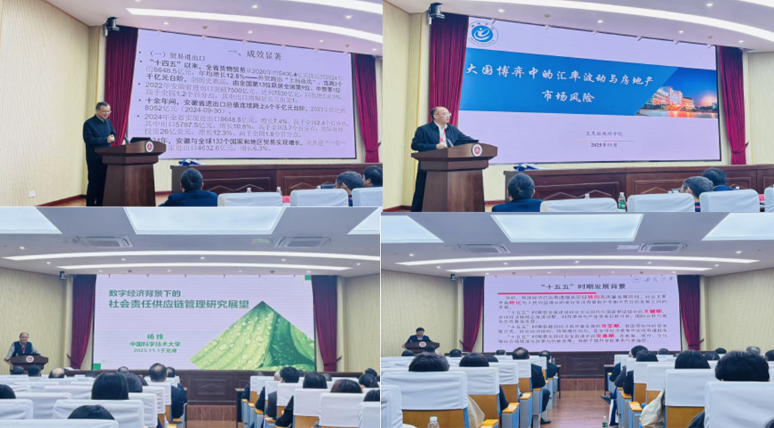 主旨演讲环节,曾凡银教授、王先柱教授、中国科学技术大学杨锋教授、安徽大学李静教授分别作了《培育安徽外贸竞争新优势》《大国博弈中的汇率波动与房地产市场风险》《数字经济背景下社会责任供应链管理研究展望》《“十五五”发展着力点与硬科技的关键性》的主旨演讲。