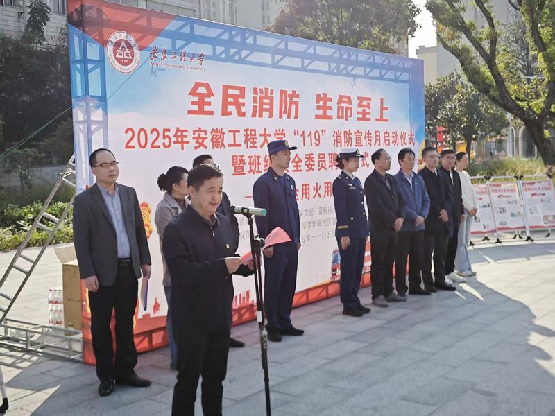 本网讯 11月5日,学校2025年119消防宣传月启动仪式暨班级安全委员聘任仪式在西区活动中心广场举行。校党委常委、副校长张开炳出席,鸠江消防救援大队和活动主办单位负责人,为民警务站、幼儿园师生、物业、食堂员工代表及2025级全体班级安全委员参加活动。