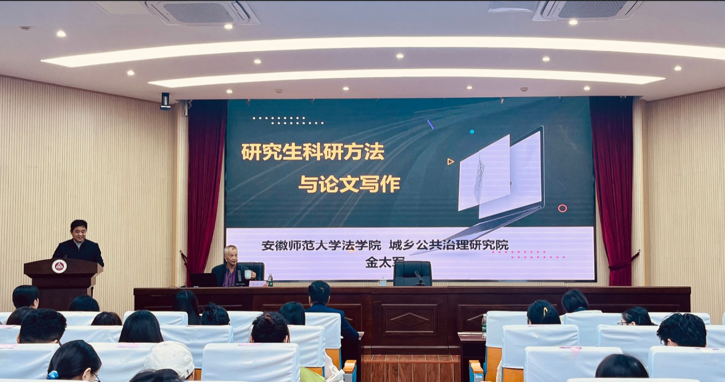本网讯 11月12日,安徽师范大学博士生导师金太军教授应邀来校,作题为“研究生科研方法与论文写作”学术报告。报告会由校党委常委、副校长张开炳主持,研究生部(党委研究生工作部)负责人及校人文社科专业研究生参加报告会。