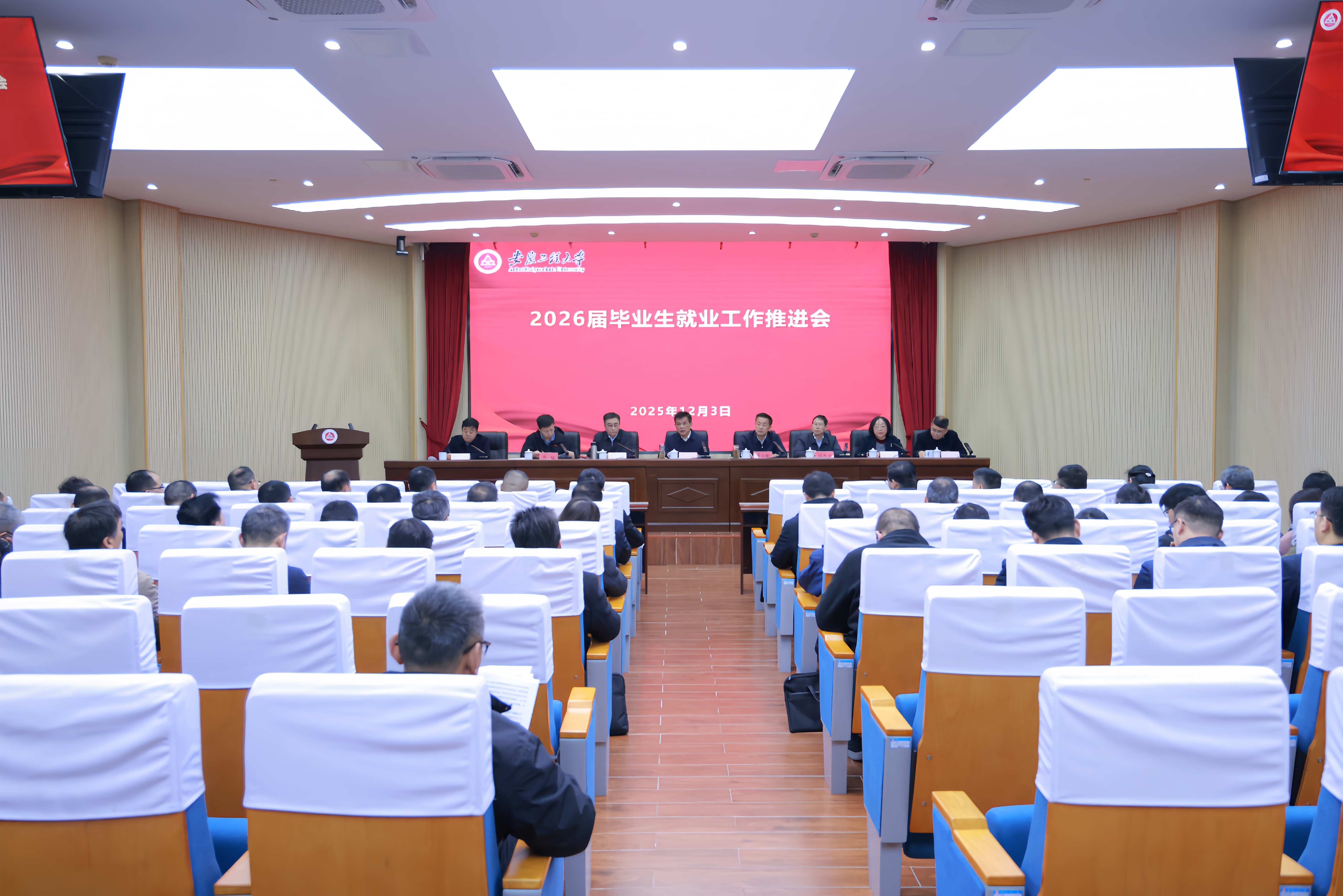 本网讯 12月3日,学校2026届毕业生就业工作推进会在A座104会议室举行。校领导卢平、黄友锐、郑健、程双四、凤权、周虹屏、张开炳、王成军出席会议,各部门、学院主要负责人参会,会议由校党委副书记、校长黄友锐主持。