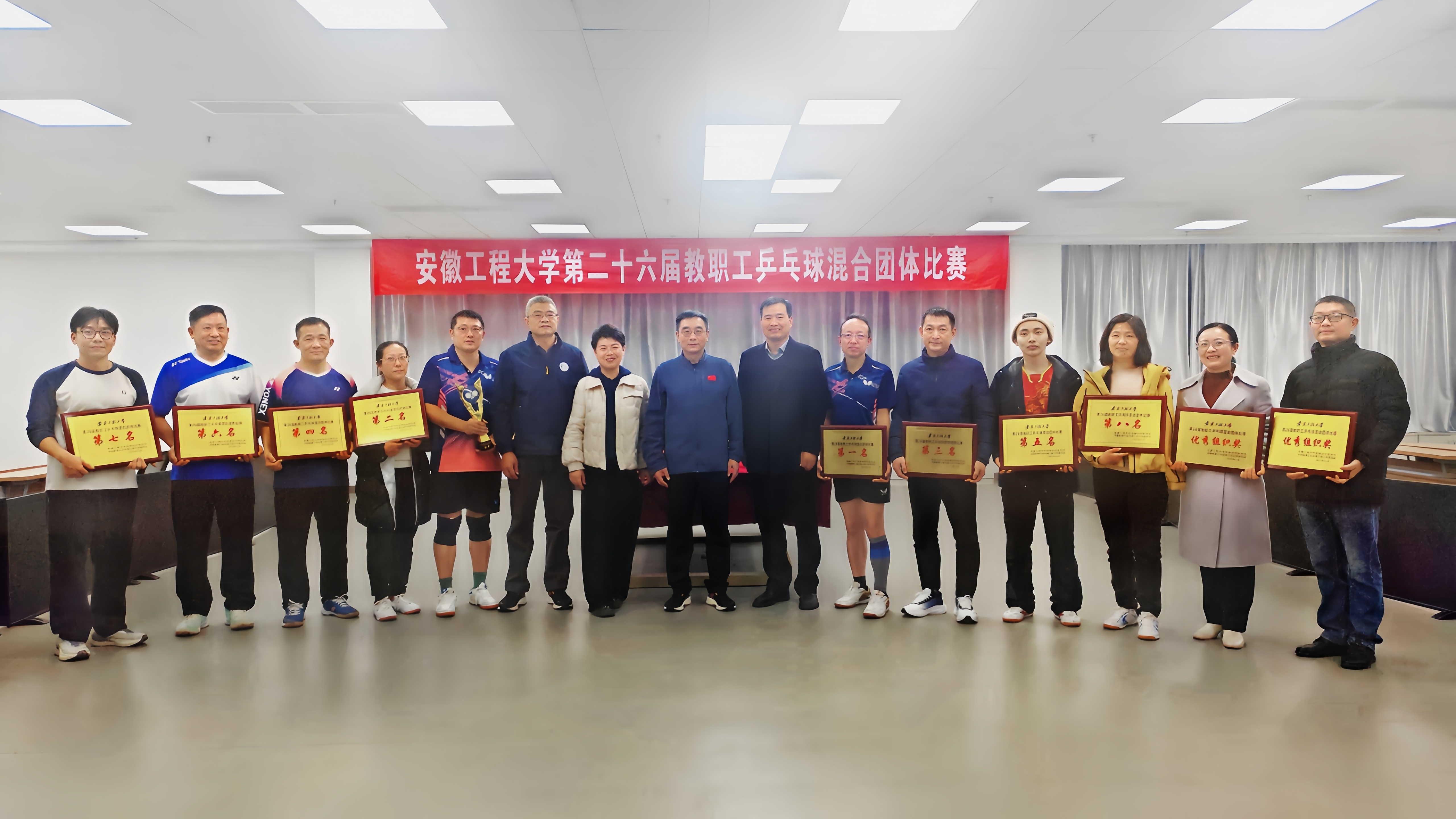 本网讯 11月20日至12月1日,学校举办“校庆杯”第二十六届教职工乒乓球混合团体赛。经过激烈角逐,化学与环境工程学院代表队摘得冠军,计算机与信息学院代表队和经济与管理学院代表队分别荣获亚军和季军,机关党委代表队和人文学院代表队获本届比赛优秀组织单位。
