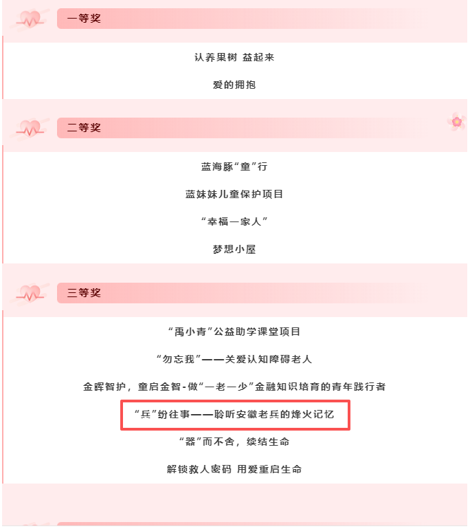本网讯 近日,“青春志愿行奉献新时代”蚌埠市2025年青年志愿服务项目大赛结果公布,由我校数理与金融学院程安琪老师指导的“老兵的故事说给你听”志愿服务项目斩获大赛三等奖。