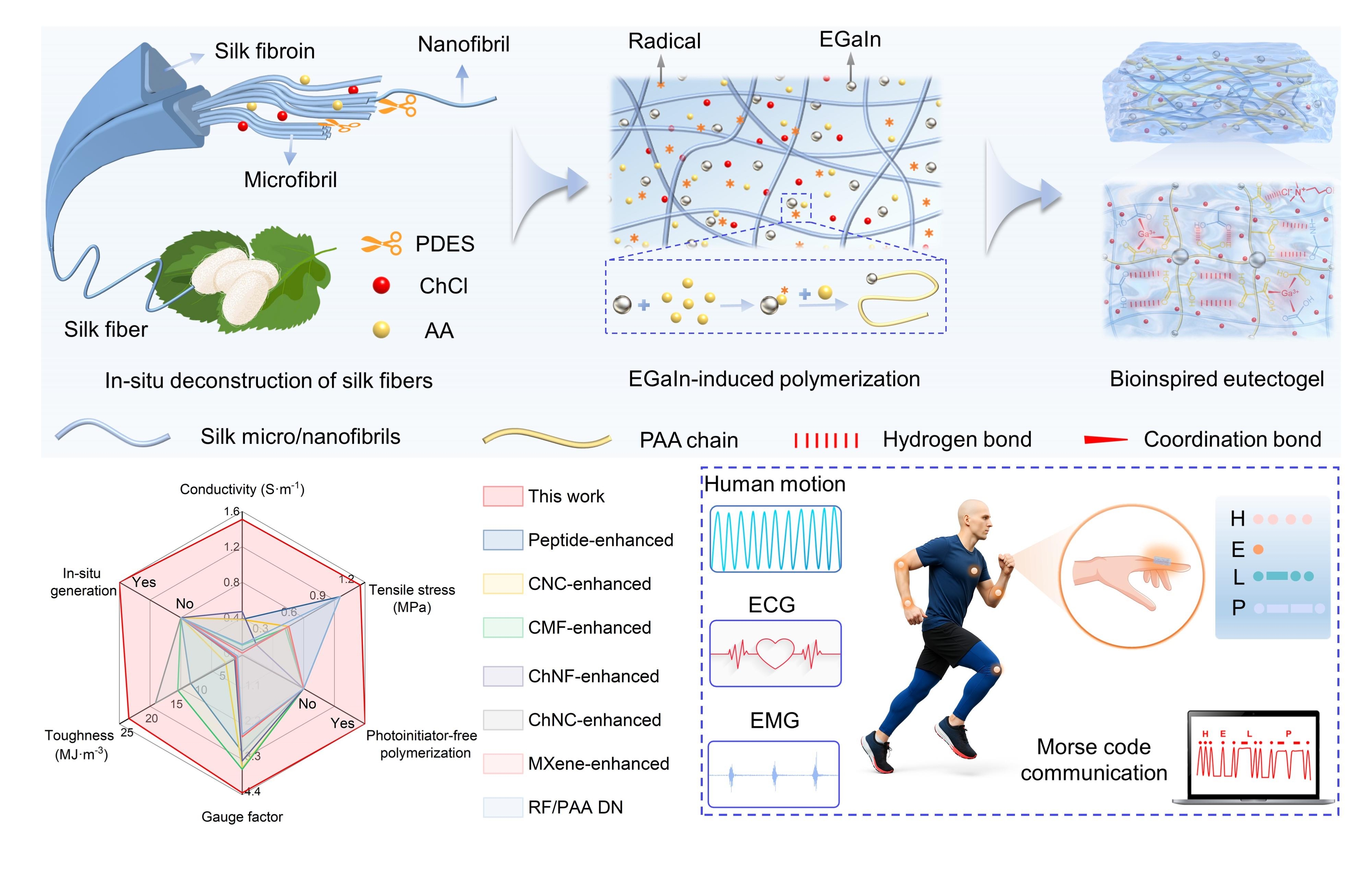 本网讯 近日,我校纺织服装学院王宗乾教授团队联合中国科学技术大学、安徽农业大学、清华大学合肥公共安全研究院等单位,在国际综合性期刊《Advanced Science》(中国科学院一区,IF=14.1)上发表了题为 “EGaIn-Activated Bioinspired Silk Micro/Nanofibril Eutectogels Breaking the Strength–Conductivity Trade-Off for High-Performance Wearable Bioelectronics” 的最新研究成果。RayBetApp官网下载 为论文通讯单位,团队教师杨海伟为第一作者。