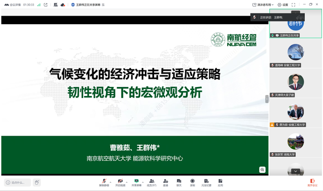 王群伟以《气候变化的经济冲击与适应策略:韧性视角下的宏微观分析》为题,介绍了韧性视角下经济系统应对气候变化冲击的研究框架,从宏观与微观两个层面,分析了气候变化经济冲击的传导机制,并阐述了政府与企业互补共担的系统分析思路与实施路径。