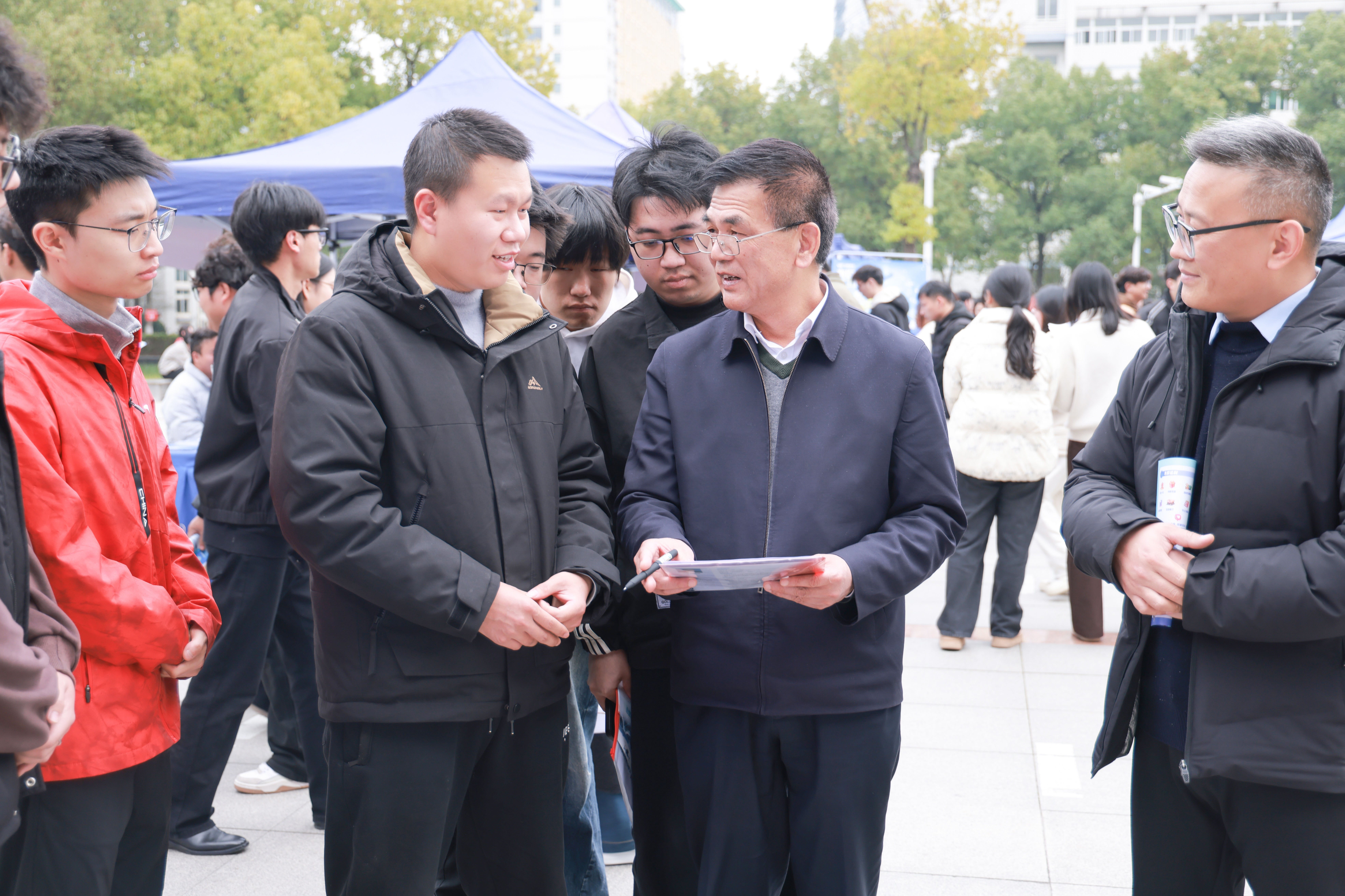 本网讯 3月11日,学校在图书综合楼广场举办2026年春季学期大型双选会,江苏、浙江、上海、安徽等长三角地区180余家优质企业来校揽才,共提供就业岗位6000余个。校党委书记卢平深入现场指导就业工作。