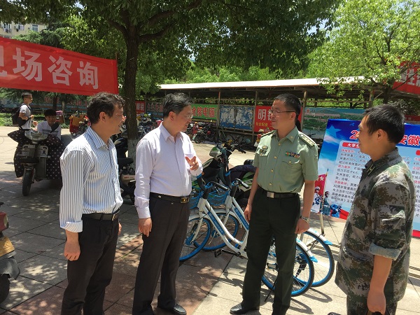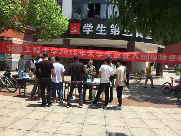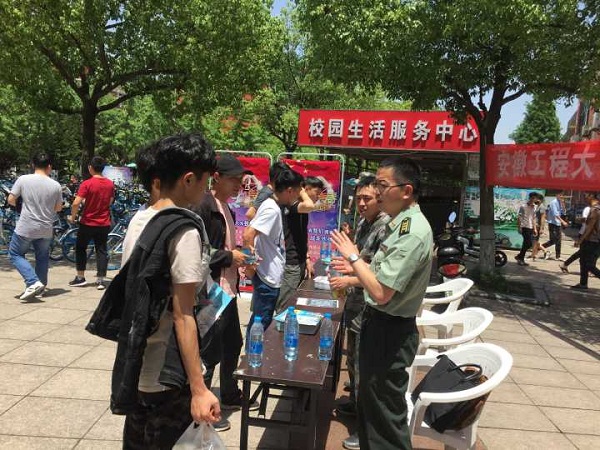 为了增强广大学生的国防意识,深入推进我校大学生征兵工作,加强征兵政策宣传,鼓励广大学生积极投身绿色军营,5月23日,学校武装部(征兵工作站)组织开展大学生征兵宣传现场咨询活动,分别在第一、第二、第三、第五学生食堂及师生活动中心广场设立咨询点,校武装部、鸠江区人武部工作人员及学校退役大学生士兵为广大学生开展现场咨询。校党委常委、副校长郭兴众莅临现场指导,鸠江区人武部部长李军、政委张勇、校武装部部长陈其峰、副部长江海参加咨询活动。