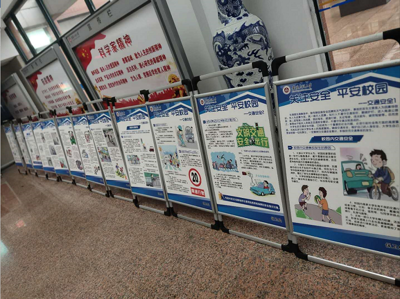 根据活动主题,保卫处制作了相关宣传横幅,宣传“知危险会避险,安全文明出行”的理念,并在学校正门、行政楼等人员密集的场所内设立12块展板,向师生进行安全知识的普及。宣传内容涉及校园内交通安全、校园内骑行注意事项、乘坐公共交通、出租车等注意事项、交通事故应急处理措施及相关急救知识,通过这些知识普及,使同学们对交通安全有了更深刻的认识与更全面的了解。