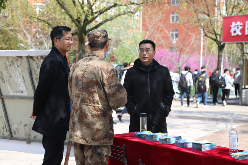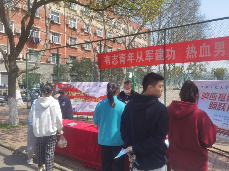 为贯彻落实上级部门有关征兵工作相关文件和会议精神,全面深入开展征兵宣传活动,进一步激发我校学生参军报国、携笔从戎的热情,3月24日,学校组织开展2021年征兵现场咨询活动,分别在一食堂、三食堂和五食堂广场设立咨询点,校党委常委、副校长郑健和鸠江区人武部政委程诚在现场亲自指导,校武装部、鸠江区人武部、校园警务站和国防教育协会为广大学生开展现场咨询。